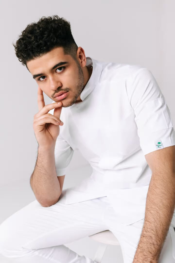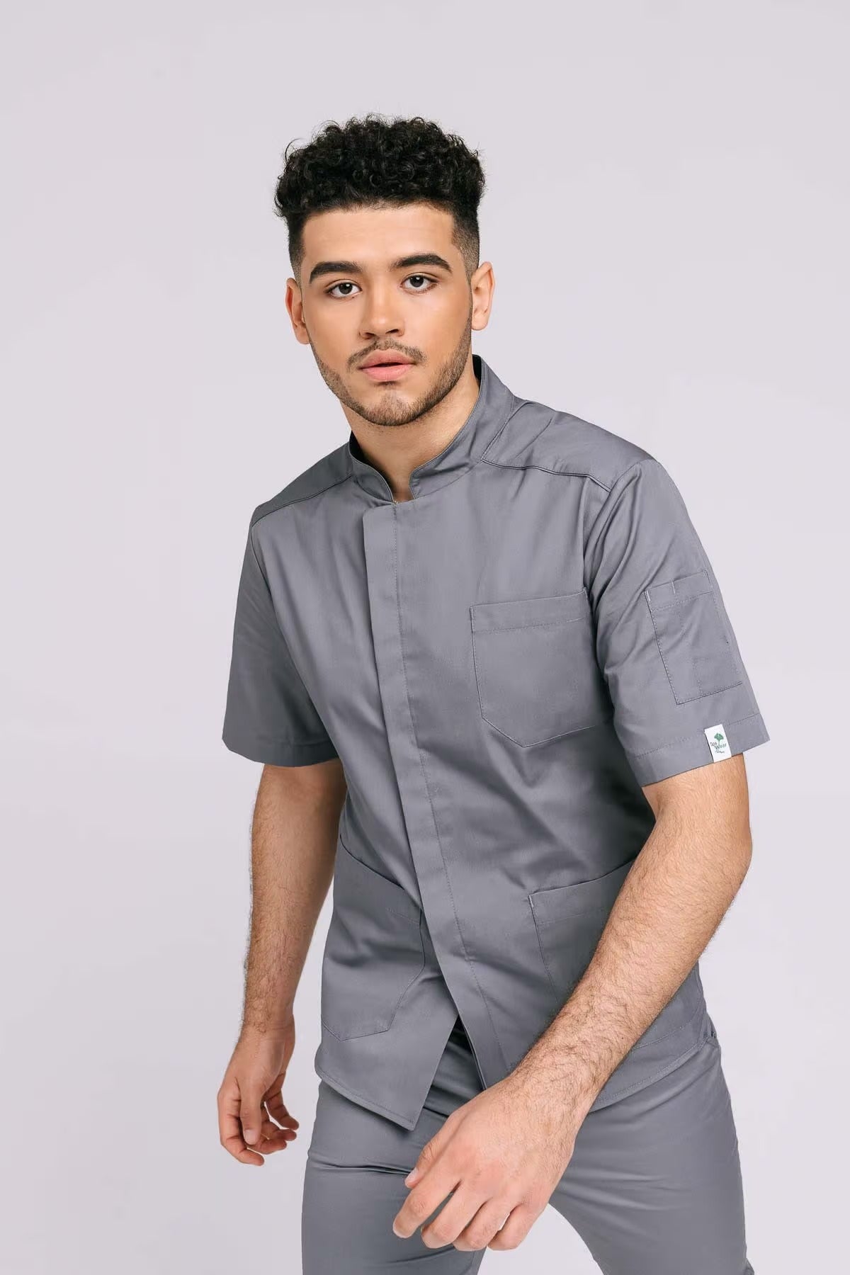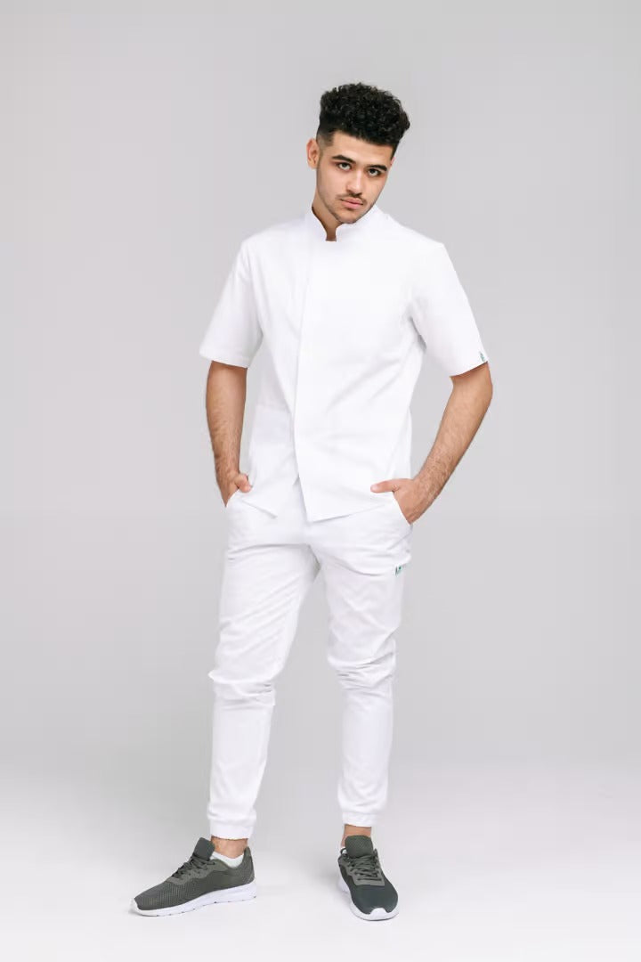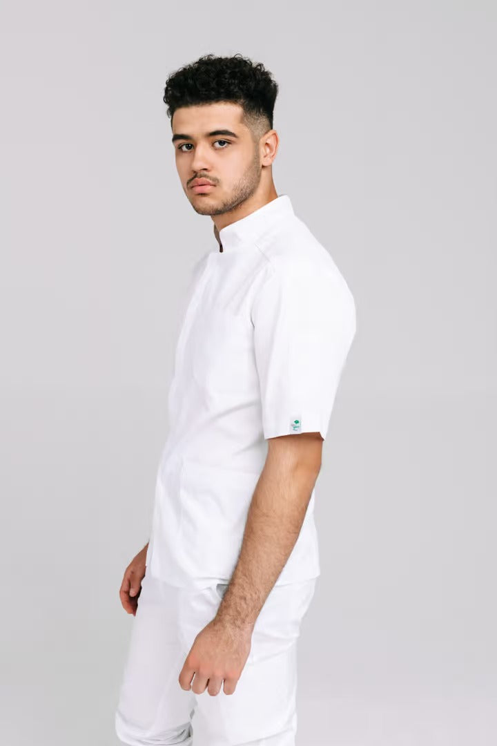 Bluza medyczna męska Kuba wykonana ze specjalistycznego, wytrzymałego materiału z wysoką zawartością splotów bawełny zapewnia on nie tylko trwałość, ale także oddychalność, co jest niezwykle ważne w trudnych warunkach pracy. Możesz być pewien, że ten fartuch przetrwa wiele godzin intensywnego użytkowania. Kolor w tym fartuchu medycznym jest odporny na pranie w temperaturze 60°C, natomiast w przypadku wariantu białego, można prać go nawet w temperaturze 90°C, co gwarantuje skuteczną dezynfekcję i utrzymanie czystości. Nasz fartuch medyczny męski jest zapinany na dyskretne, ukryte napy, które zapewniają łatwe i szybkie zdejmowanie oraz zakładanie. Posiada on elegancką stójkę oraz trzy naszywane kieszenie zabezpieczone ryglami które pomieszczą wszystkie niezbędne narzędzia i przybory, które musisz mieć pod ręką, zapewniając Ci wygodę i funkcjonalność. Na lewym ramieniu bluzy odnajdziesz małą kieszonkę idealną na długopis. Dzięki naszemu fartuchowi medycznemu z elegancką stójką, ukrytymi napami oraz praktycznymi kieszeniami, będziesz gotowy do pracy na najwyższym poziomie.