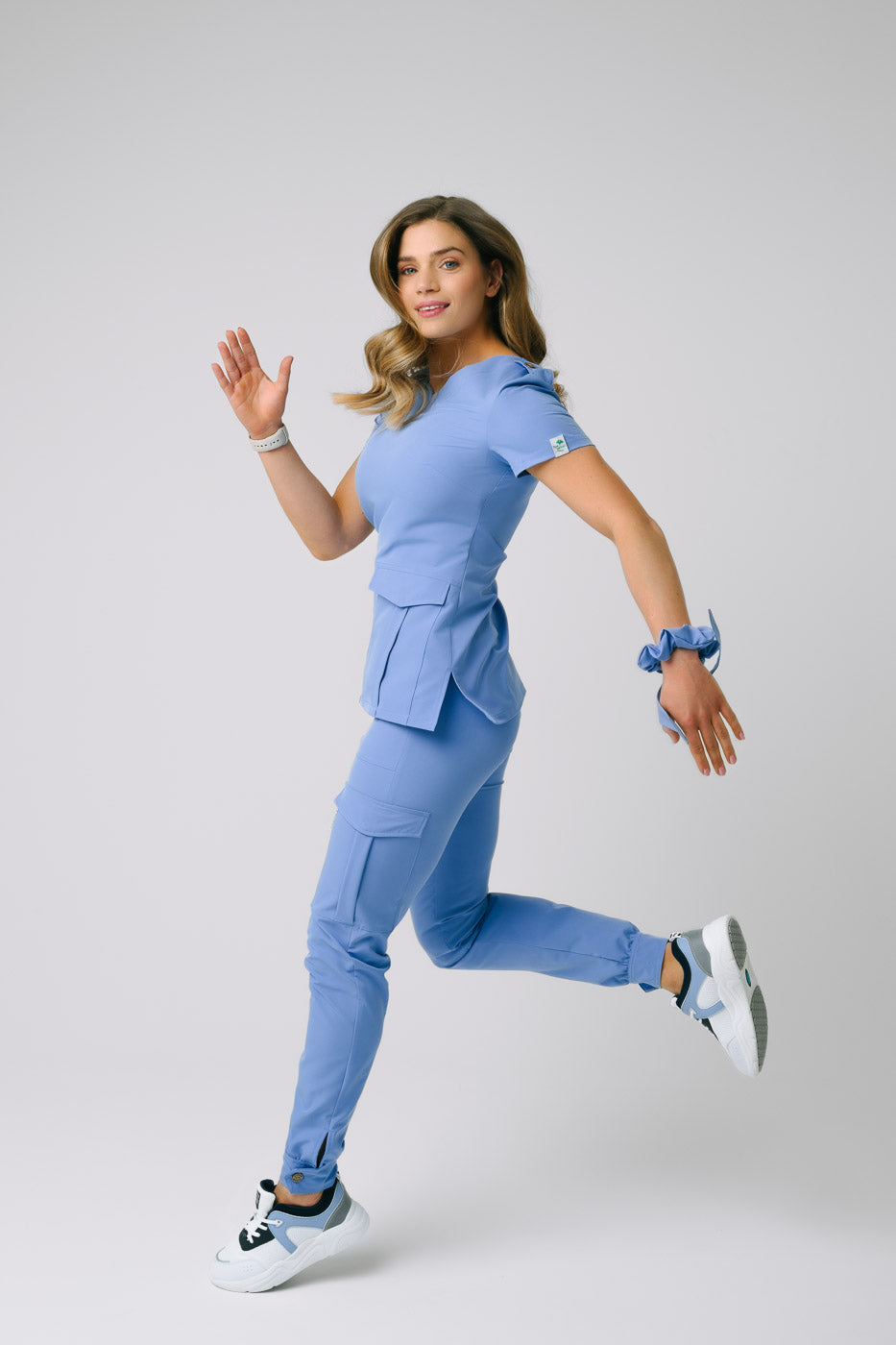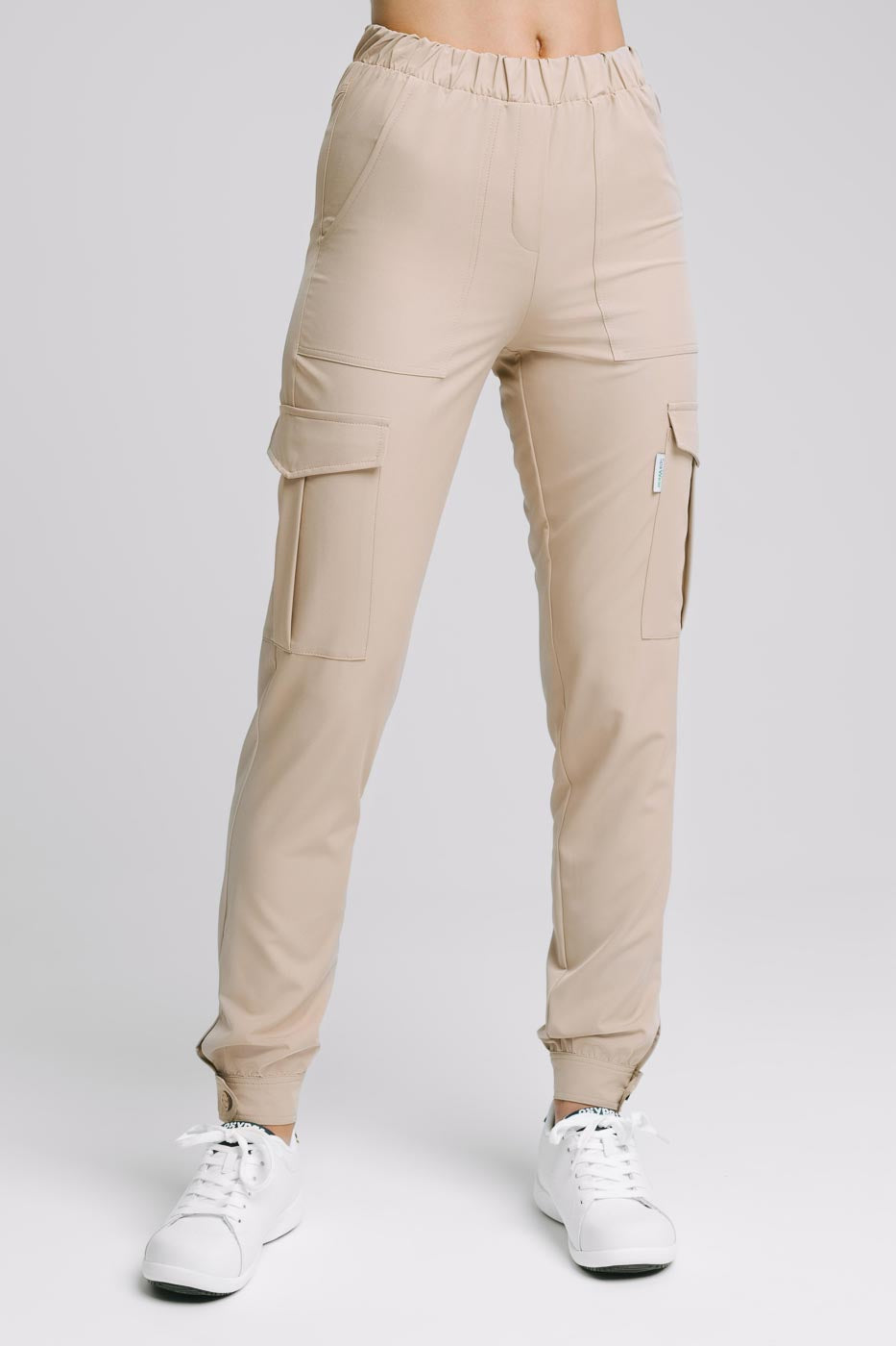 Spodnie medyczne Etna wykonane z lejącego, elastycznego w czterech kierunkach materiału. W pasie znajduje się rozciągliwa guma, przyszyta w trzech miejscach tak aby nie uległa złamaniu ani wywinięciu. Na przodzie znajdują się dwie naszywane kieszenie, a po bokach dwie bojówkowe kieszenie zapinane na niewidzialną od zewnątrz napę. Dół spodni zakończyliśmy mankietem z pagonem oraz kokosowym guziczkiem. Aby maksymalnie ułatwić wkładanie stopy zastosowaliśmy pęknięcie zakończone ryglem.