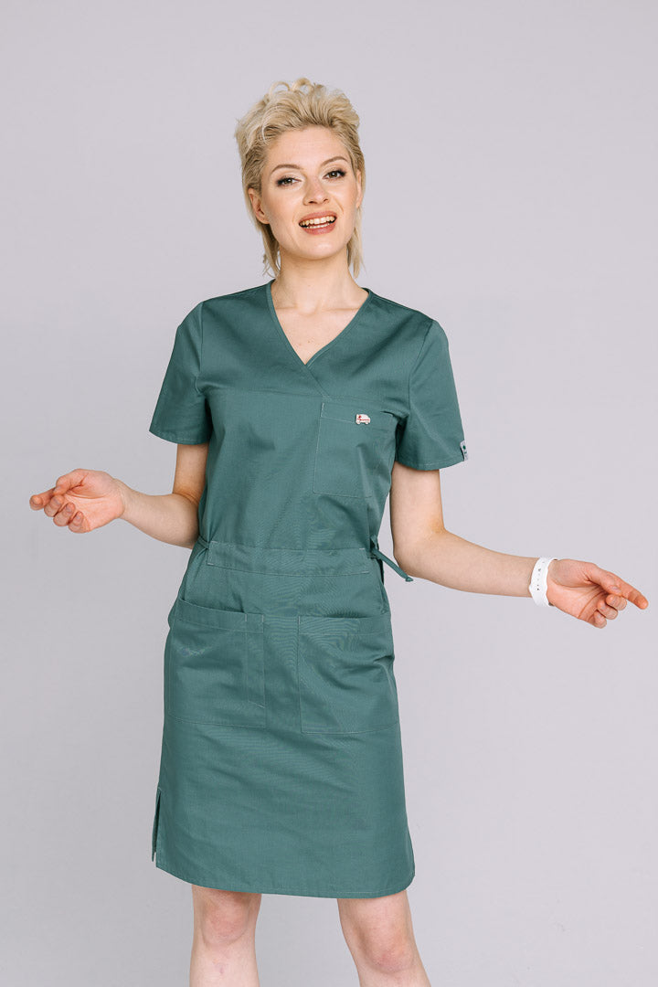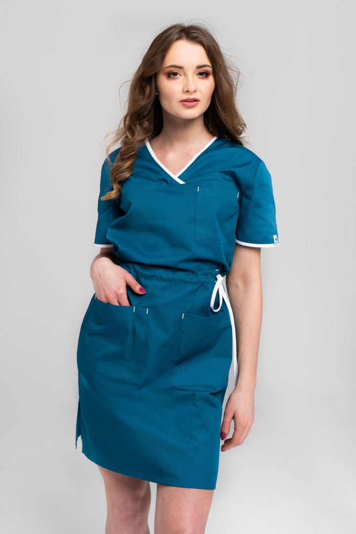 Sukienka medyczna damska Blanka to nowoczesna propozycja dla kobiet pracujących w przychodniach, szpitalach oraz gabinetach lekarskich. Jest to bardzo wygodny krój prostej, klasycznej sukienki ozdobionej lamówką oraz ryglami przy każdej kieszeni, co oprócz uroku wzmacnia produkt. Sukienka w wygodny a zarazem nietypowy sposób wiązana jest w talii co daje możliwość każdej kobiecie dopasować ją do swojej figury albo humoru danego dnia. Fartuszek posiada trzy duże kieszenie niezbędne w codziennej pracy.