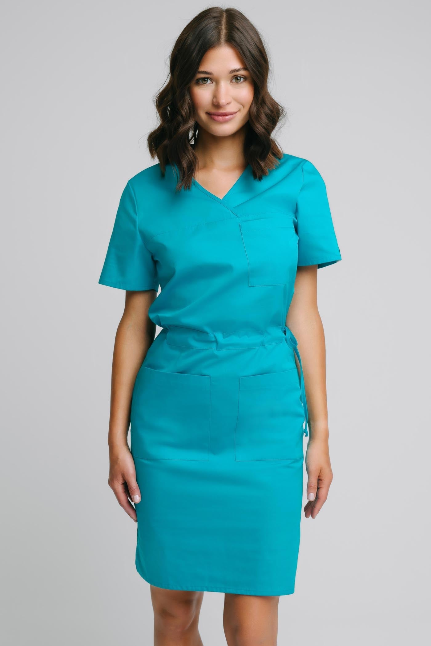 Sukienka medyczna damska Blanka to nowoczesna propozycja dla kobiet pracujących w przychodniach, szpitalach oraz gabinetach lekarskich. Jest to bardzo wygodny krój prostej, klasycznej sukienki ozdobionej lamówką oraz ryglami przy każdej kieszeni, co oprócz uroku wzmacnia produkt. Sukienka w wygodny a zarazem nietypowy sposób wiązana jest w talii co daje możliwość każdej kobiecie dopasować ją do swojej figury albo humoru danego dnia. Fartuszek posiada trzy duże kieszenie niezbędne w codziennej pracy.
