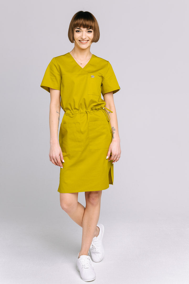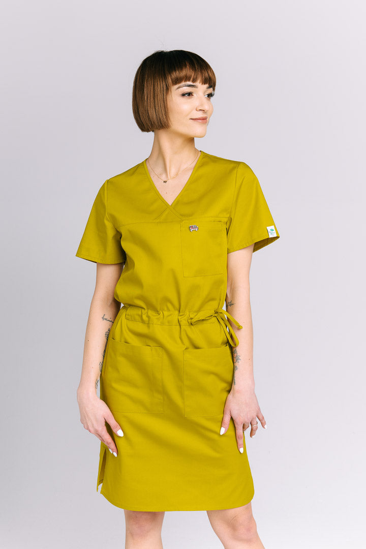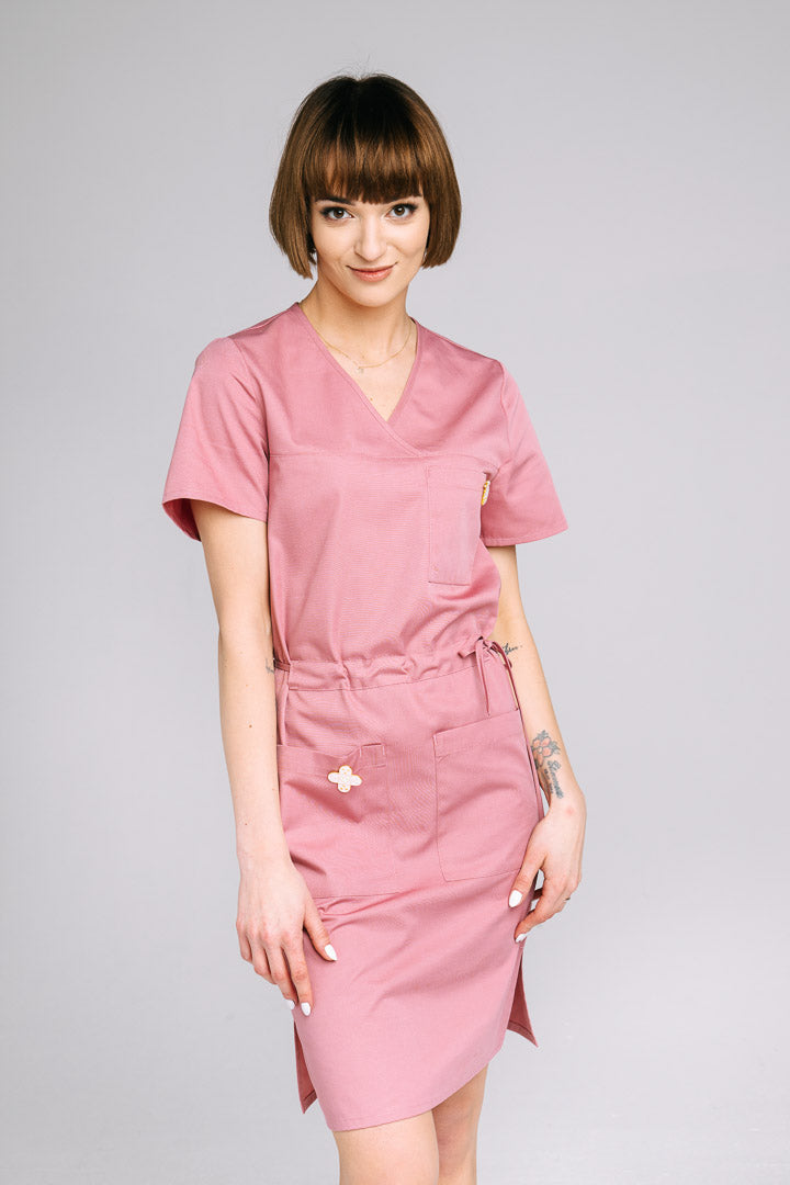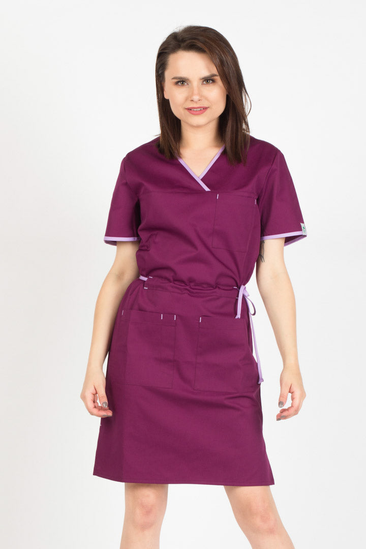 Sukienka medyczna damska Blanka to nowoczesna propozycja dla kobiet pracujących w przychodniach, szpitalach oraz gabinetach lekarskich. Jest to bardzo wygodny krój prostej, klasycznej sukienki ozdobionej lamówką oraz ryglami przy każdej kieszeni, co oprócz uroku wzmacnia produkt. Sukienka w wygodny a zarazem nietypowy sposób wiązana jest w talii co daje możliwość każdej kobiecie dopasować ją do swojej figury albo humoru danego dnia. Fartuszek posiada trzy duże kieszenie niezbędne w codziennej pracy.