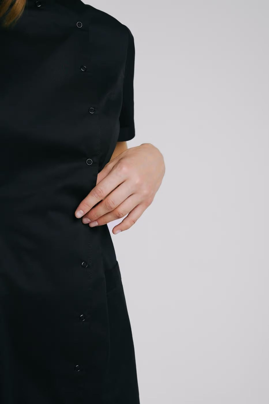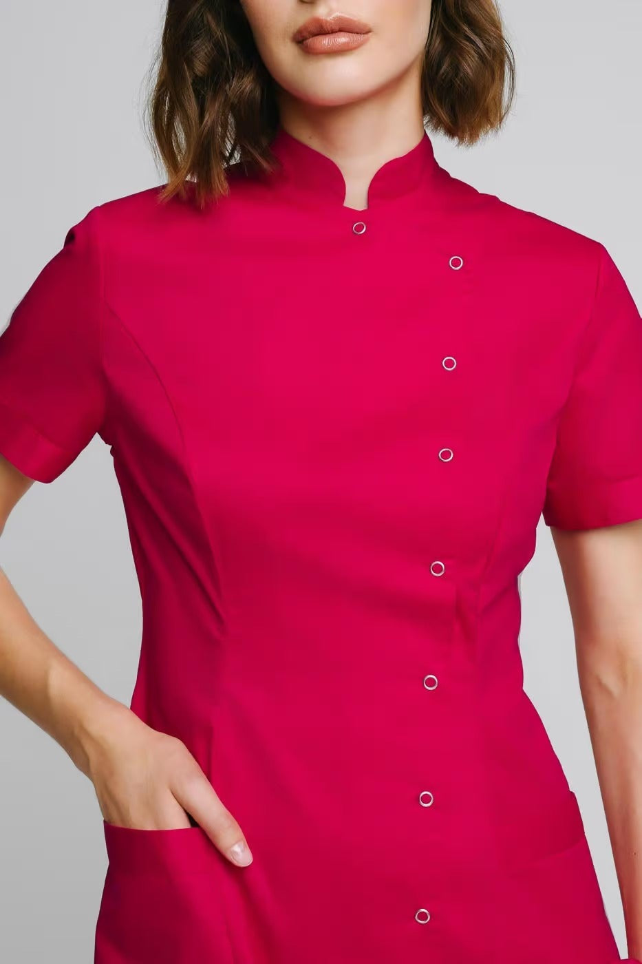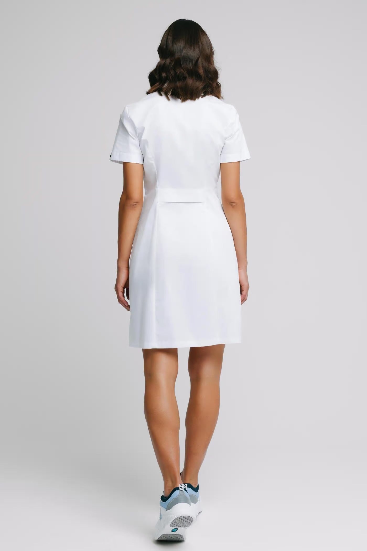Fartuch medyczny długi Iga premium/+ jest uszyty z elastycznego, wytrzymałego materiału z wysoką zawartością splotów bawełny. Strój zapinany pod szyję to doskonałe rozwiązanie dla kobiet ceniących wygodę oraz subtelność. Wersja premium tego modelu posiada dwie duże kieszenie, stójkę oraz jest zapinana na napy. Sukienkę śmiało możesz prać w 60℃. Elastyczny materiał sukienki medycznej 'Iga premium' wykorzystujemy już w naszych scrubsach medycznych model „Lena” oraz „Sonia”. Dodatkiem świetnie uzupełniającym strój jest krótka frotka, którą możesz dokupić >tutaj<.