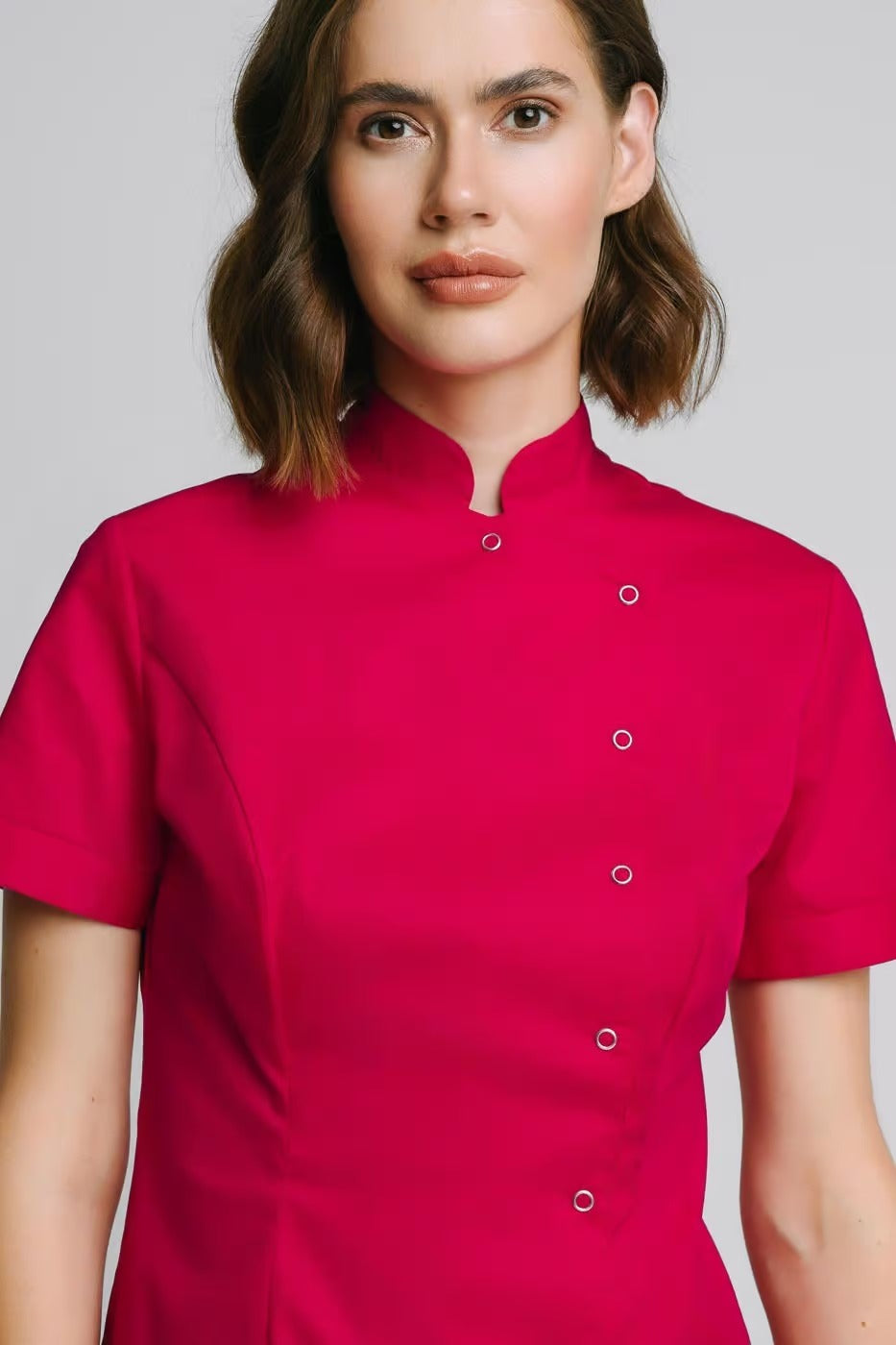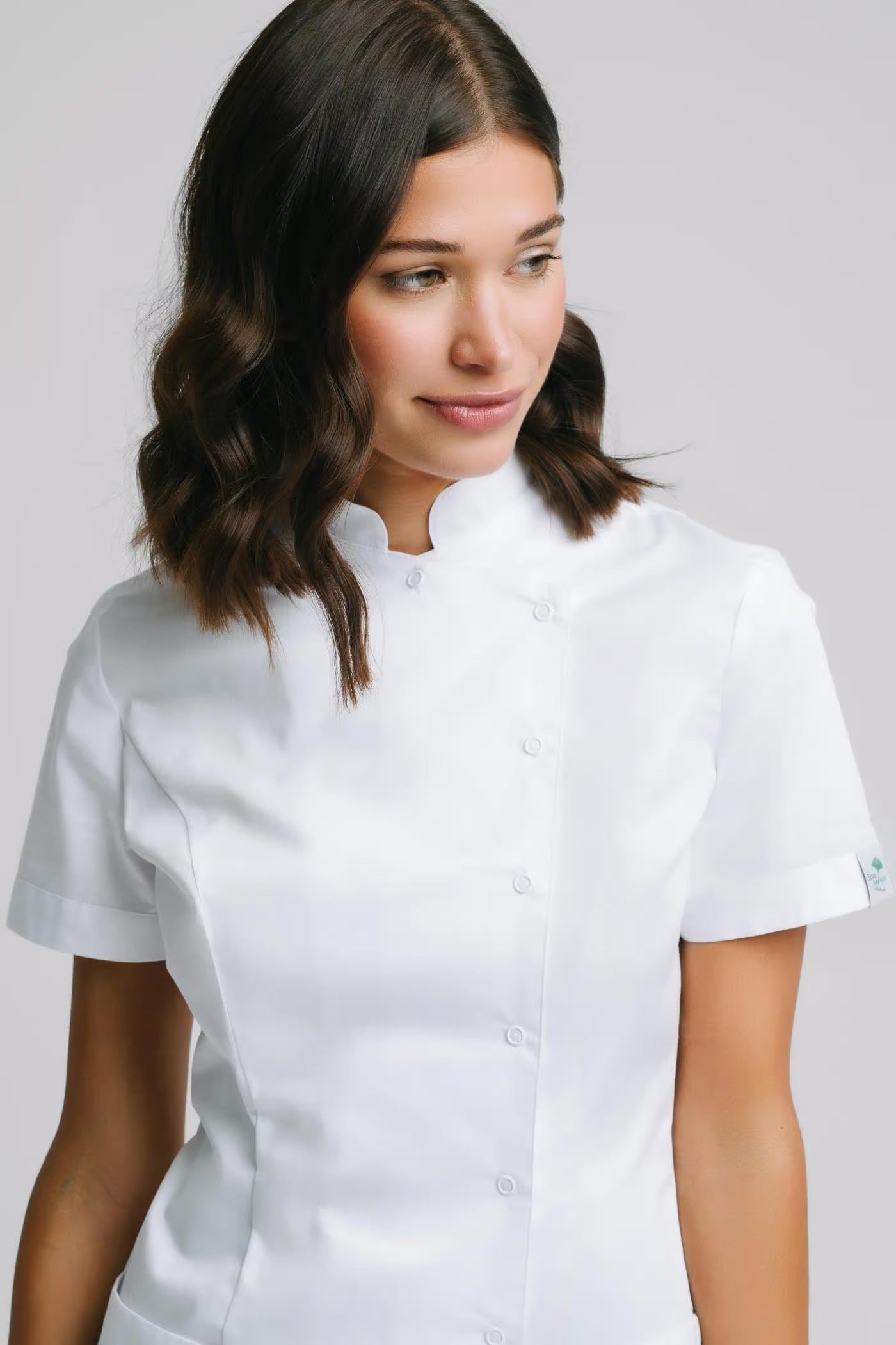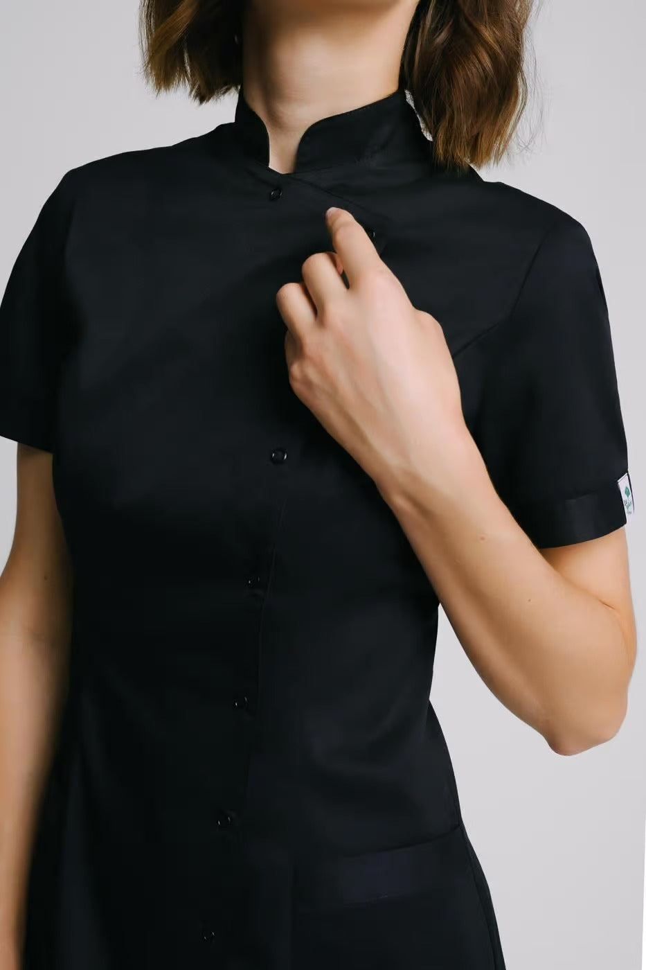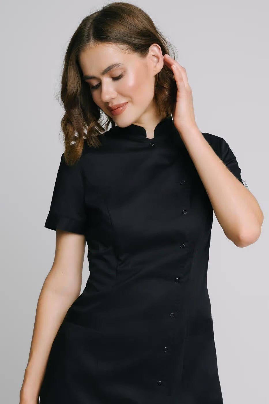 Fartuch medyczny długi Iga premium/+ jest uszyty z elastycznego, wytrzymałego materiału z wysoką zawartością splotów bawełny. Strój zapinany pod szyję to doskonałe rozwiązanie dla kobiet ceniących wygodę oraz subtelność. Wersja premium tego modelu posiada dwie duże kieszenie, stójkę oraz jest zapinana na napy. Sukienkę śmiało możesz prać w 60℃. Elastyczny materiał sukienki medycznej 'Iga premium' wykorzystujemy już w naszych scrubsach medycznych model „Lena” oraz „Sonia”. Dodatkiem świetnie uzupełniającym strój jest krótka frotka, którą możesz dokupić >tutaj<.