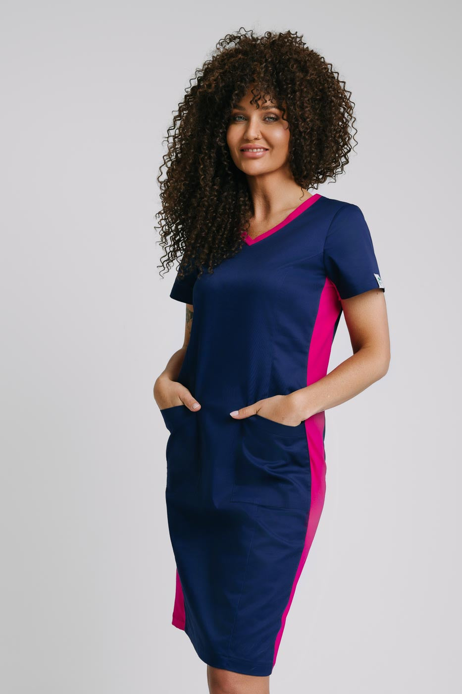 Sukienka medyczna Klara+/premium  jest wykonana z elastycznego, wytrzymałego materiału z wysoką zawartością splotów bawełny. Jeżeli cenisz sobie jakość i lubisz jak po długim czasie używania sukienka wygląda jak nowa to świetnie trafiłaś! Elastyczny materiał tej sukienki medycznej wykorzystujemy już w naszych scrubsach medycznych model „Lena” oraz „Sonia”. Sukienkę śmiało możesz prać w 60℃. Jest to bardzo wygodny krój prostej, klasycznej sukienki ozdobionej ryglami przy każdej kieszeni oraz rozporku, co oprócz dodania uroku wzmacnia produkt, ponad to w boki sukienki oraz dekolt wszyte są pasy z dzianiny, dzięki którym sukienka medyczna jest przewiewna i elastyczna. Dodatkiem świetnie uzupełniającym strój jest krótka frotka, którą możesz dokupić >tutaj<.