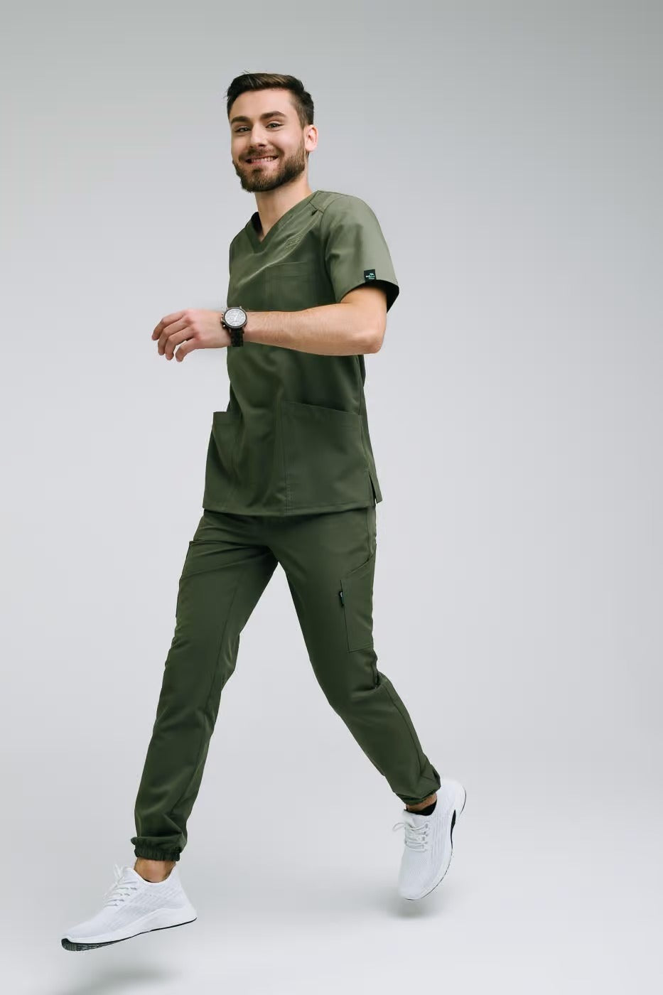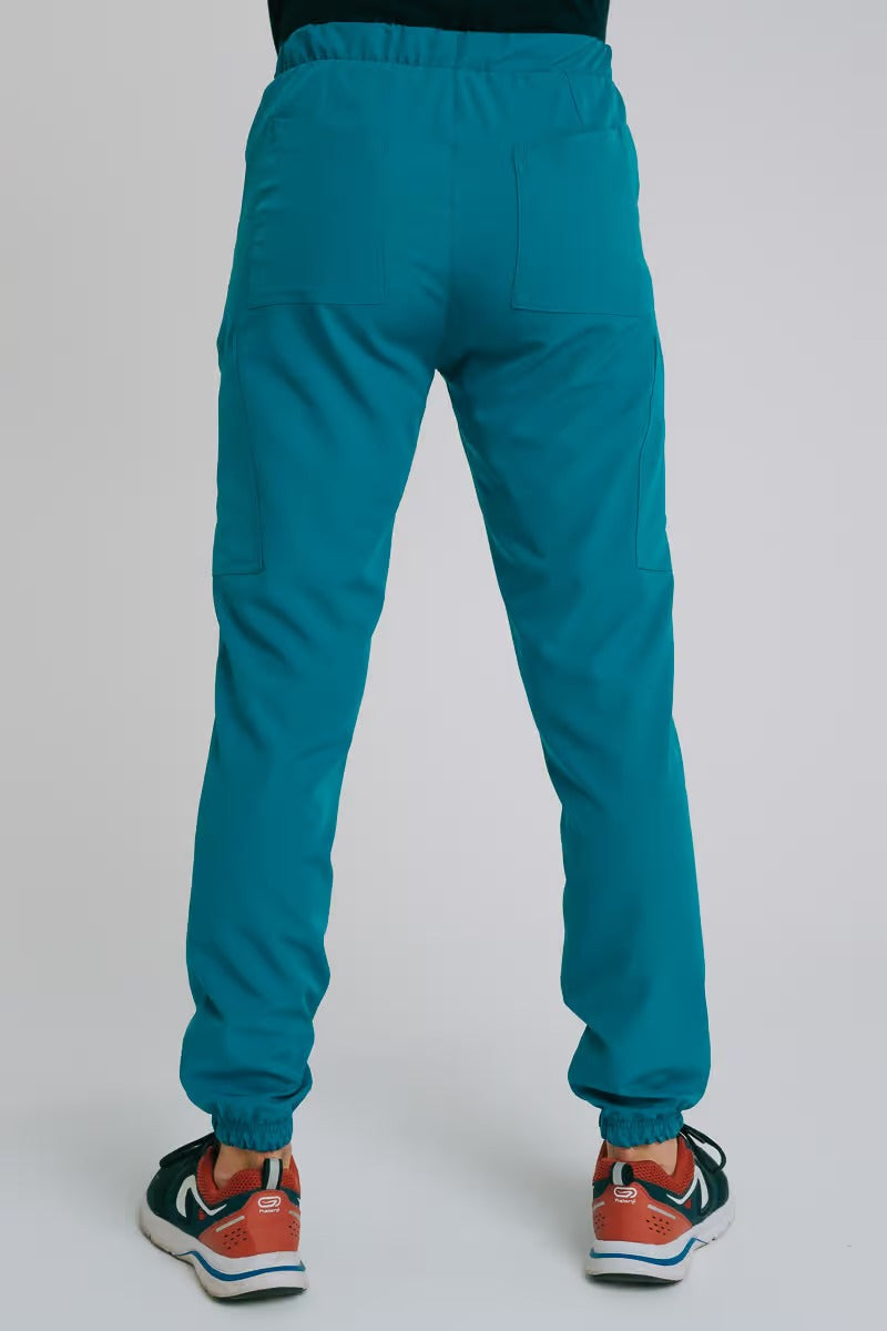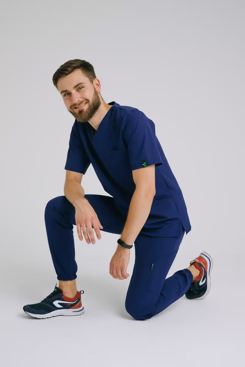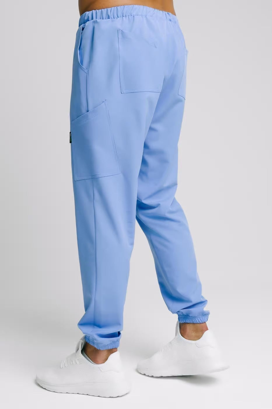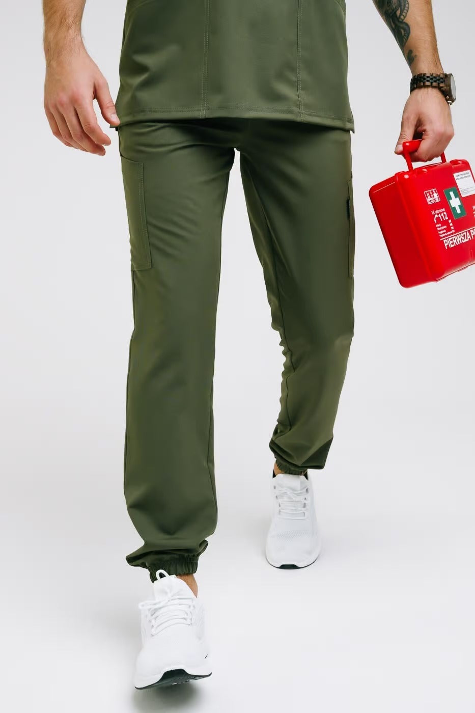 Spodnie medyczne męskie wykonane z lejącego, elastycznego w czterech kierunkach, chłodnego w dotyku materiału idealnego na ciepłe dni. Posiadają sześć kieszeni, gumę i sznurek w pasie. Kieszenie mają skośny kształt a przy tym są duże, tak aby zmieścić bez problemu stetoskop czy Twojego smartfona. Każda kieszeń zabezpieczona jest specjalistycznymi ryglami które oprą się wielokrotnemu praniu i nie ustąpią przed mnóstwem Twoich bibelotów w kieszeniach. Guma w pasie jest bardzo rozciągliwa dzięki czemu w tych spodniach poczujesz się jak w domowych dresikach. Również tutaj nie zapomnieliśmy o praktyczności, gumę dookoła pasa wszywamy w złączenie materiału więc śmiało możesz wielokrotnie prać spodnie nie martwiąc się, że zmienią swój kształt. Dbając o każdy szczegół, ozdobny sznurek z naszym logo zabezpieczyliśmy metalowymi końcówkami i przyszyliśmy z tyłu do paska, żeby kokarda była zawsze równa a Ty żebyś nigdy nie musiał agrafką przewlekać wypadającego sznurka. Idealnym dopełnieniem wizualnym joggerów medycznych Nathan są przeszycia na kieszeniach oraz przy dolnych gumach szyte specjalistyczną maszyną dwuigłówką.