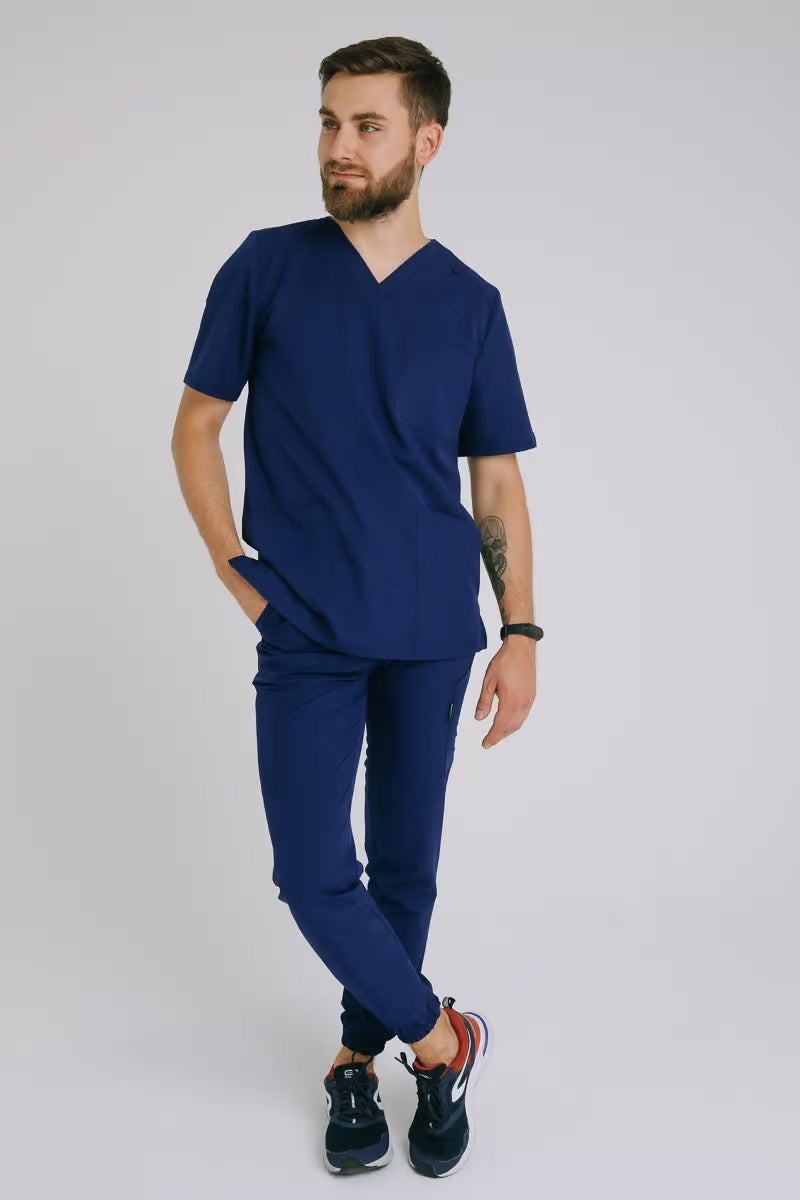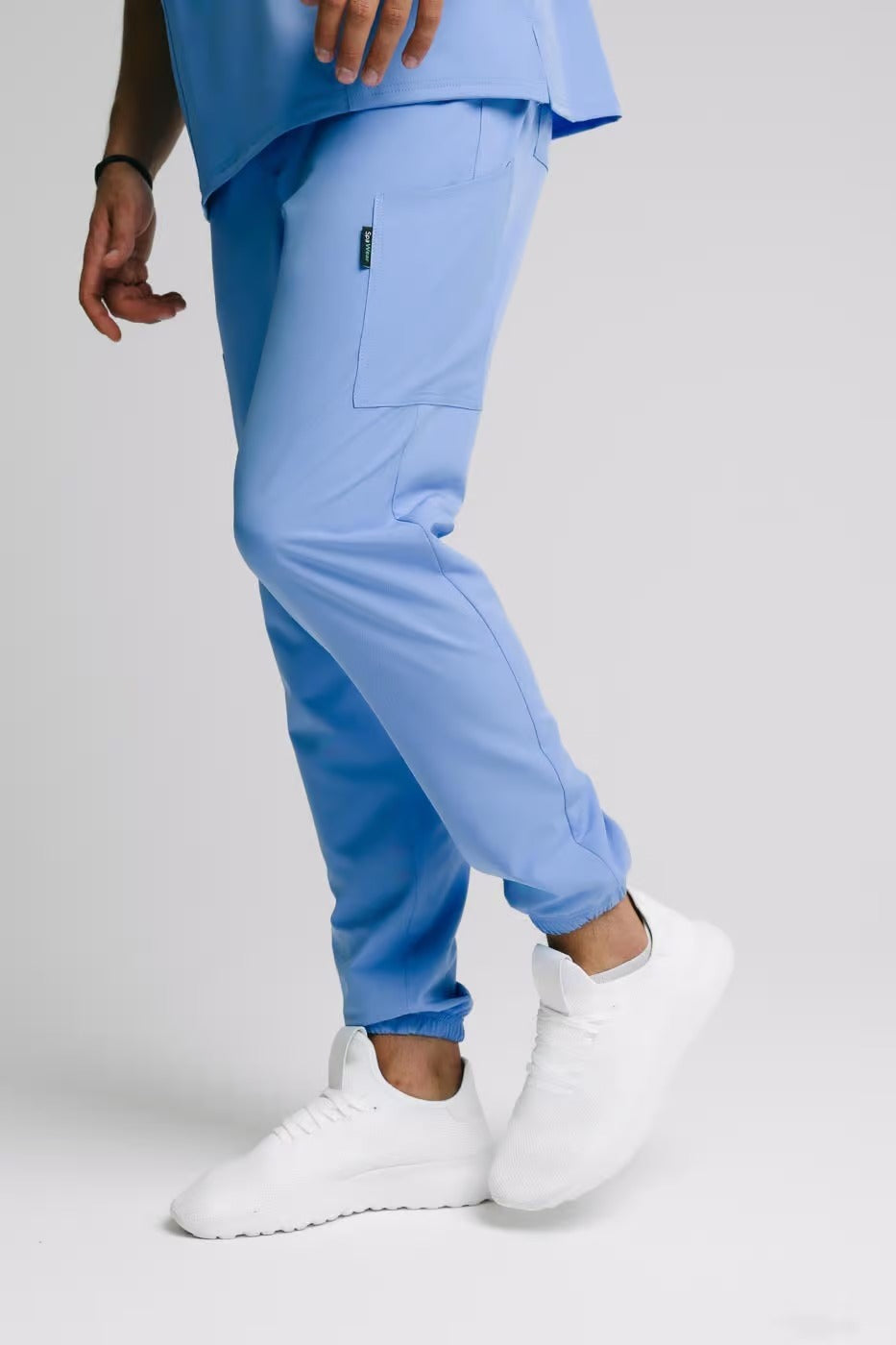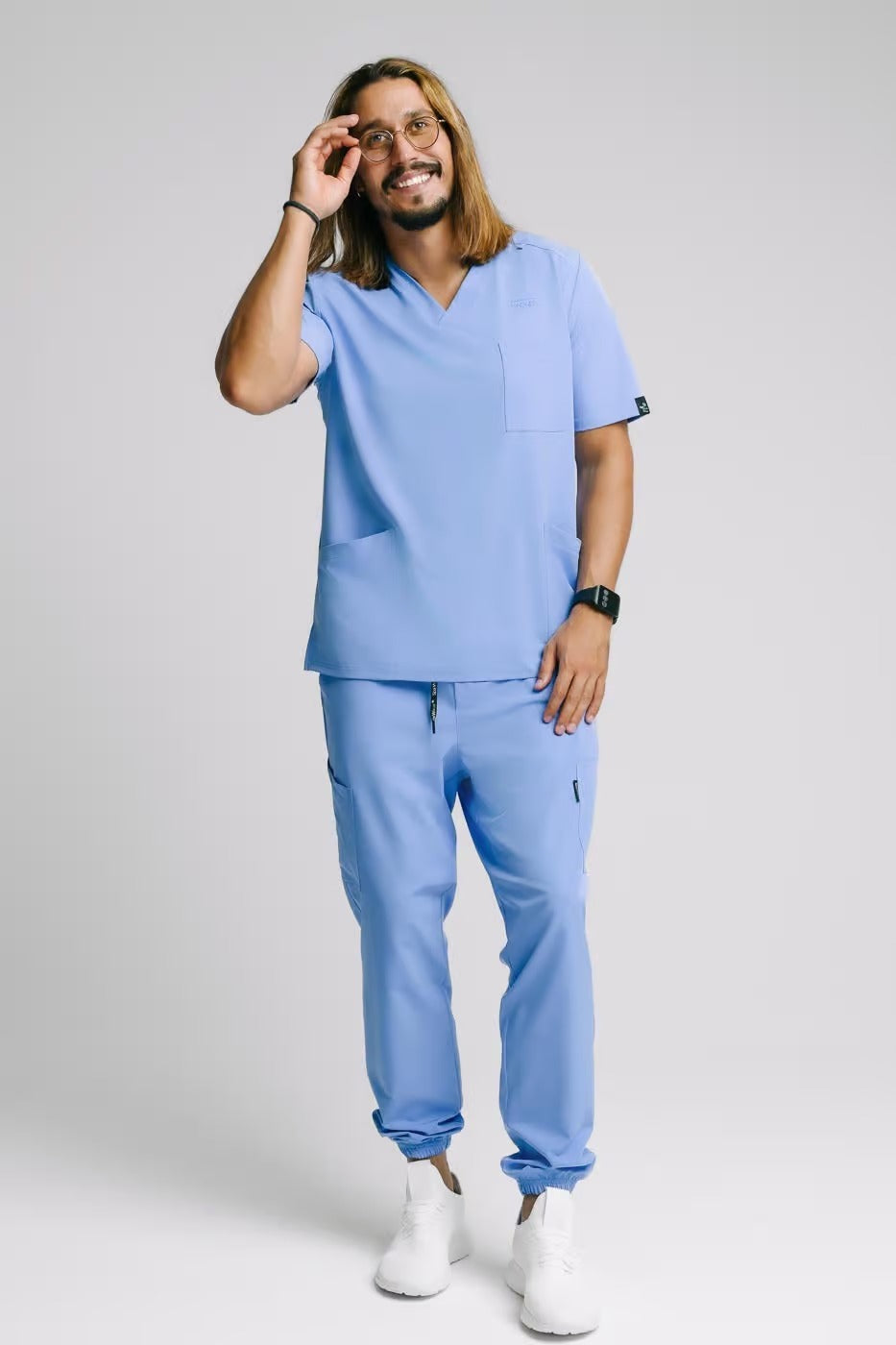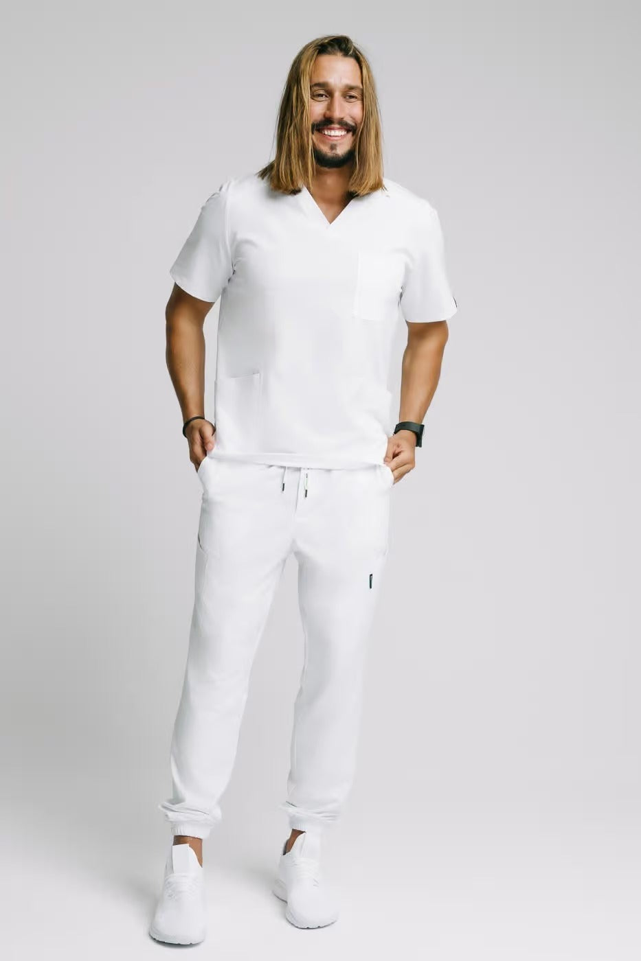 Spodnie medyczne męskie wykonane z lejącego, elastycznego w czterech kierunkach, chłodnego w dotyku materiału idealnego na ciepłe dni. Posiadają sześć kieszeni, gumę i sznurek w pasie. Kieszenie mają skośny kształt a przy tym są duże, tak aby zmieścić bez problemu stetoskop czy Twojego smartfona. Każda kieszeń zabezpieczona jest specjalistycznymi ryglami które oprą się wielokrotnemu praniu i nie ustąpią przed mnóstwem Twoich bibelotów w kieszeniach. Guma w pasie jest bardzo rozciągliwa dzięki czemu w tych spodniach poczujesz się jak w domowych dresikach. Również tutaj nie zapomnieliśmy o praktyczności, gumę dookoła pasa wszywamy w złączenie materiału więc śmiało możesz wielokrotnie prać spodnie nie martwiąc się, że zmienią swój kształt. Dbając o każdy szczegół, ozdobny sznurek z naszym logo zabezpieczyliśmy metalowymi końcówkami i przyszyliśmy z tyłu do paska, żeby kokarda była zawsze równa a Ty żebyś nigdy nie musiał agrafką przewlekać wypadającego sznurka. Idealnym dopełnieniem wizualnym joggerów medycznych Nathan są przeszycia na kieszeniach oraz przy dolnych gumach szyte specjalistyczną maszyną dwuigłówką.