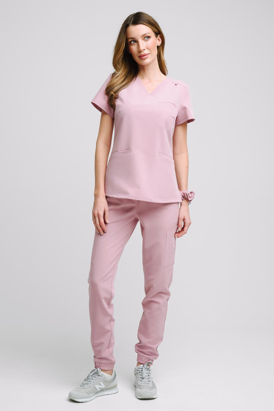 Spodnie medyczne joggery Natalie Viscon uszyte z wysokogatunkowej i miękkiej tkaniny Viscon z bogatą zawartością splotów wiskozy. Posiadają sześć kieszeni i jedną mniejszą w lewej kieszeni, gumę i sznurek w pasie. Kieszenie mają skośny kształt dzięki czemu pięknie wysmuklają nogi a przy tym są duże, tak aby zmieścić bez problemu stetoskop czy Twojego smartfona. Każda kieszeń zabezpieczona jest specjalistycznymi ryglami które oprą się wielokrotnemu praniu i nie ustąpią przed mnóstwem rzeczy w kieszeniach. Guma w pasie jest bardzo rozciągliwa dzięki czemu w tych spodniach poczujesz się jak w domowych dresikach. Również tutaj nie zapomnieliśmy o praktyczności, gumę dookoła pasa wszywamy w złączenie materiału więc śmiało możesz wielokrotnie prać spodnie nie martwiąc się, że zmienią swój kształt. Dbając o każdy szczegół, elegancki szary sznurek zabezpieczyliśmy metalowymi końcówkami z wygrawerowanym logo i przyszyliśmy z tyłu do paska, żeby kokardka była zawsze równa a Ty żebyś nigdy nie musiała agrafką przewlekać wypadającego sznurka.