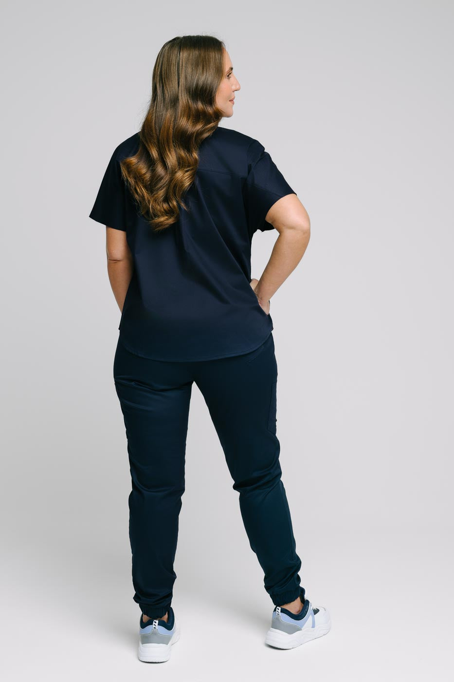 Elementem wykańczającym przód bluzy jest wygodna stójka, która delikatnie rozchodzi się na boki, aby subtelnie podkreślić dekolt. Rękawy ubrania mają kimonowy kształt, więc nie dotykają pach przy poruszaniu się i są niezwykle wygodne. Nad tyłem pracowaliśmy równie uważnie jak nad przodem, więc złożony jest on z dwóch elementów – górnego nad łopatkami spływającego aż do ramion oraz dolnego z kontrafałdą na plecach. To ulepszenie zastosowaliśmy, aby zmaksymalizować praktyczność oraz wygodę bluzy medycznej.