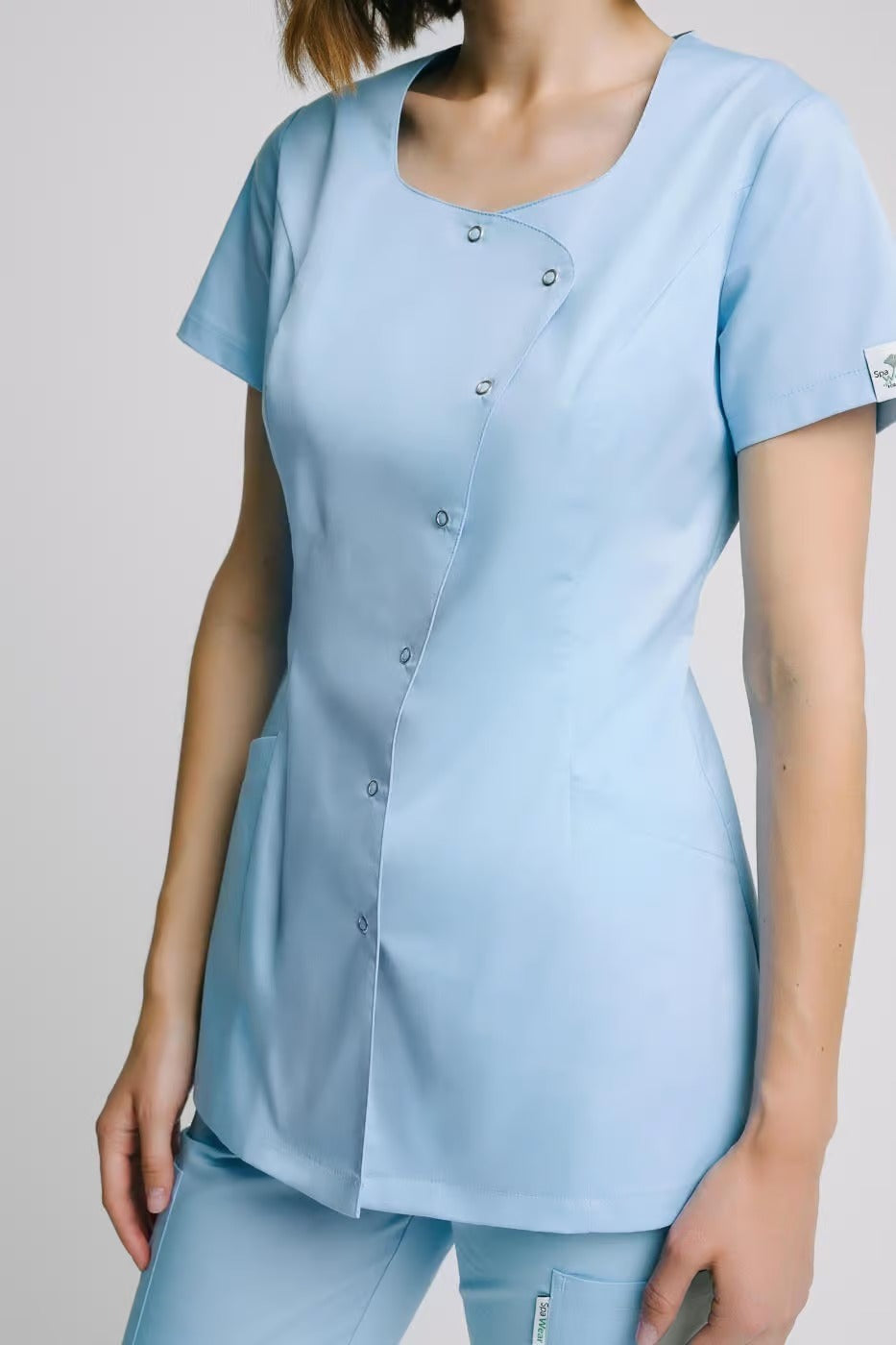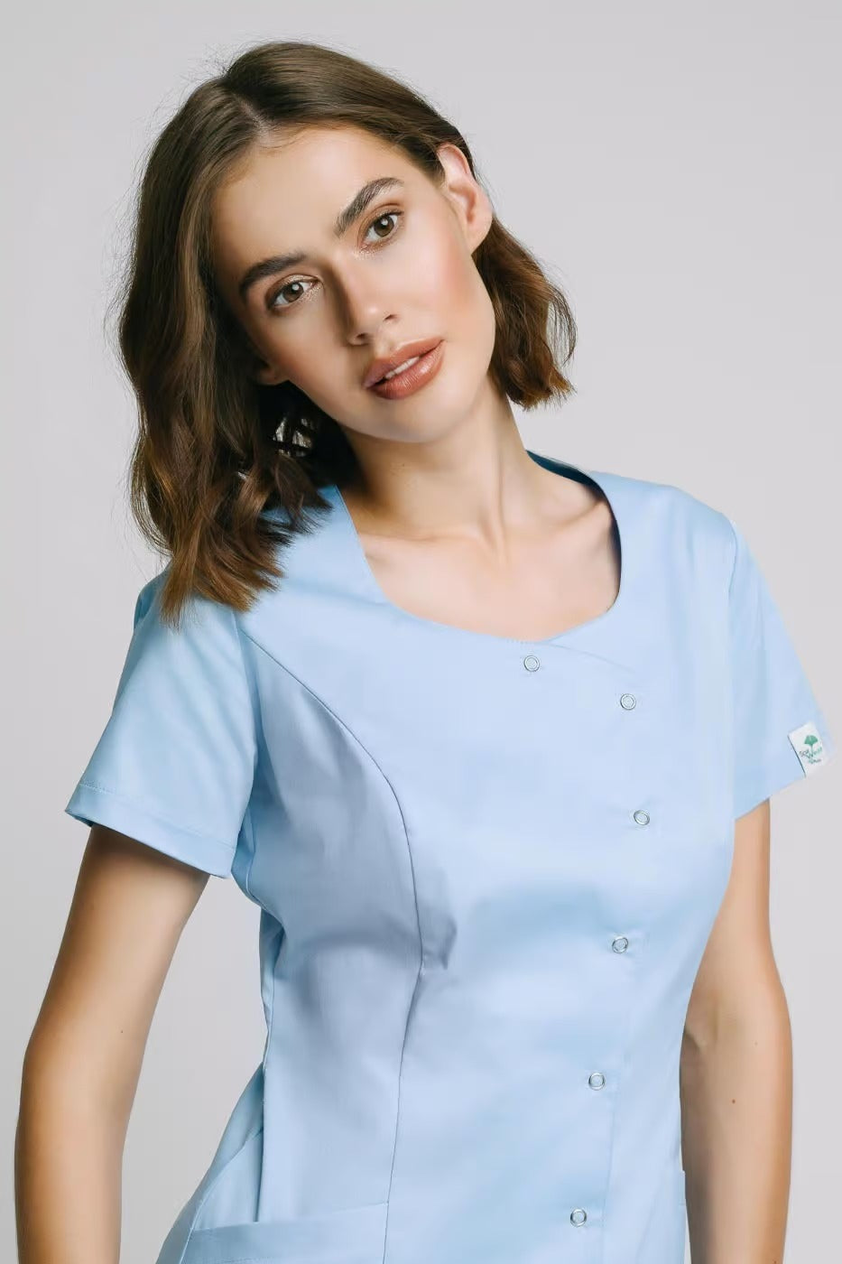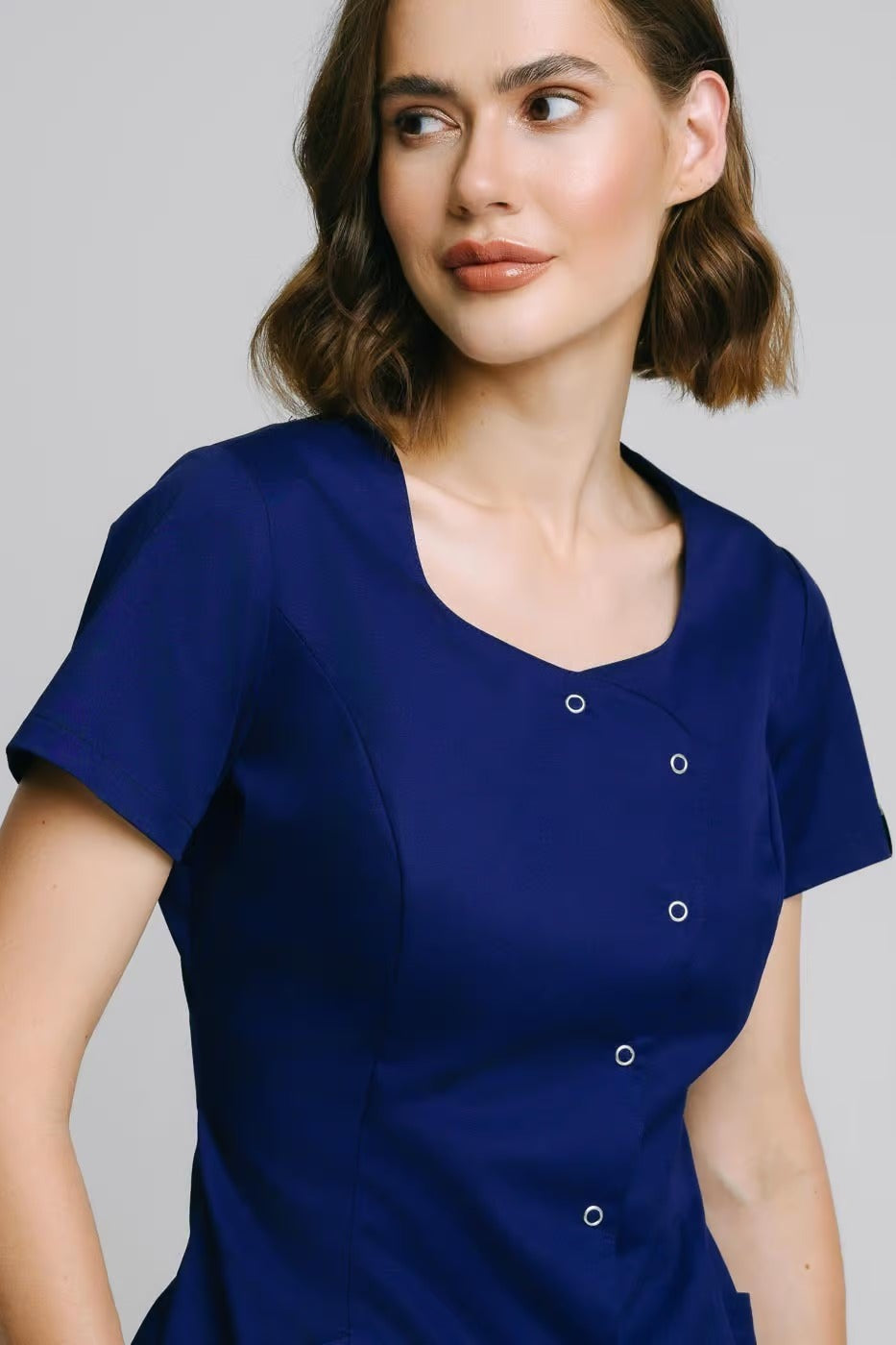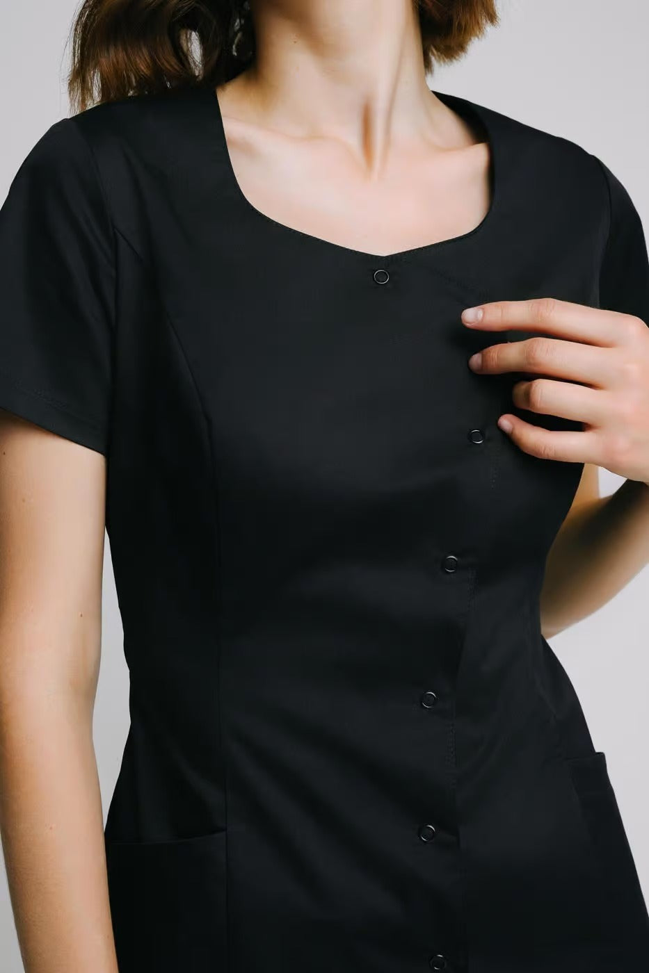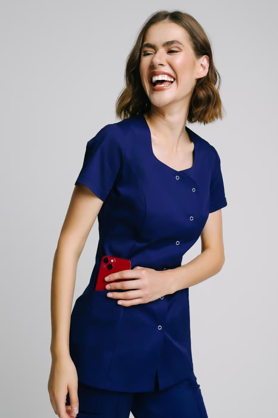 Fartuch medyczny model Claudia premium/+ jest uszyty z elastycznego, wytrzymałego materiału z wysoką zawartością splotów bawełny. Jeżeli poszukujesz fartucha w którym będziesz się czuła jak w scrubsie to idealne trafiłaś. Wersja premium tego modelu przede wszystkim jest elastyczna, posiada dwie duże kieszenie, dekolt w U, zapinany jest na napy. Fartuszek śmiało możesz prać w 60℃. Elastyczny materiał fartucha medycznego 'Claudia' wykorzystujemy już w naszych scrubsach medycznych model „Lena” oraz „Sonia” więc możesz dobrać pasujące spodnie z tych modeli. Dodatkiem świetnie uzupełniającym strój jest krótka frotka, którą możesz dokupić >tutaj<.