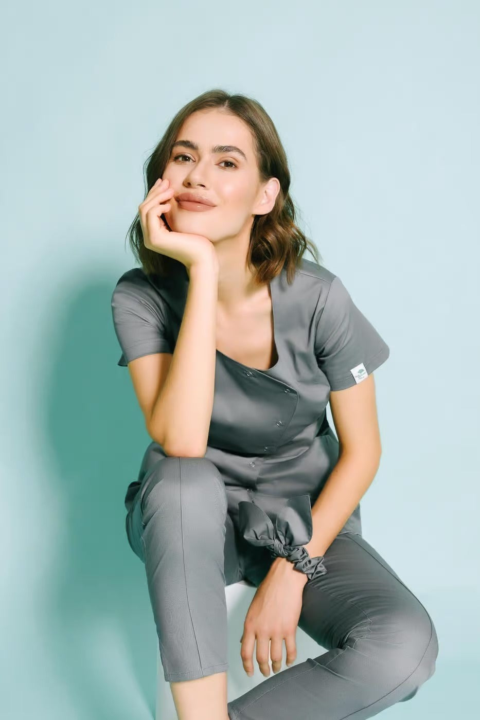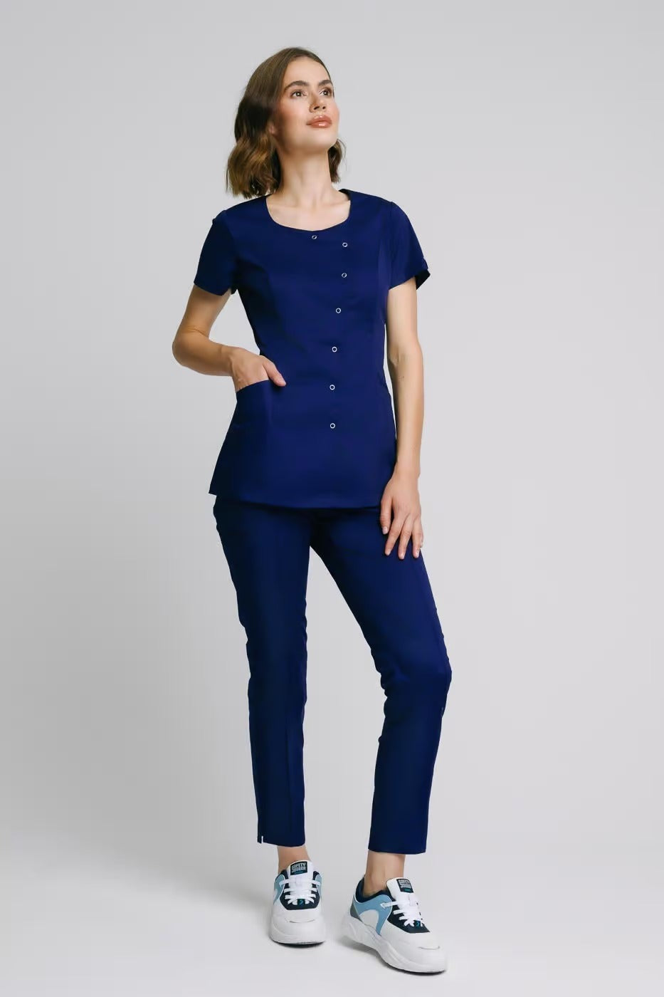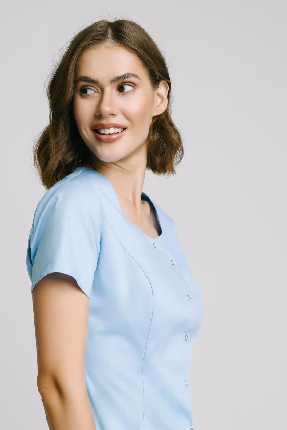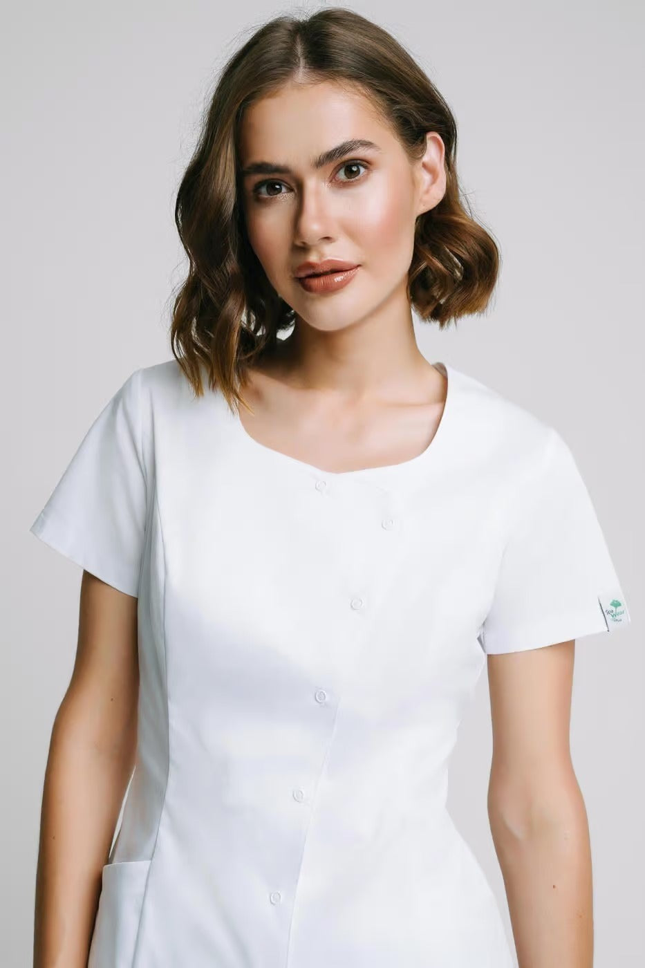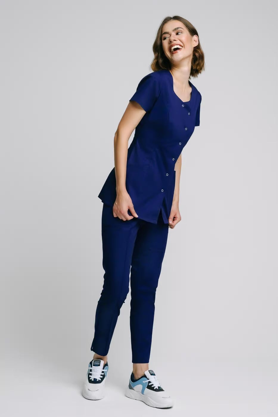 Fartuch medyczny model Claudia premium/+ jest uszyty z elastycznego, wytrzymałego materiału z wysoką zawartością splotów bawełny. Jeżeli poszukujesz fartucha w którym będziesz się czuła jak w scrubsie to idealne trafiłaś. Wersja premium tego modelu przede wszystkim jest elastyczna, posiada dwie duże kieszenie, dekolt w U, zapinany jest na napy. Fartuszek śmiało możesz prać w 60℃. Elastyczny materiał fartucha medycznego 'Claudia' wykorzystujemy już w naszych scrubsach medycznych model „Lena” oraz „Sonia” więc możesz dobrać pasujące spodnie z tych modeli. Dodatkiem świetnie uzupełniającym strój jest krótka frotka, którą możesz dokupić >tutaj<.