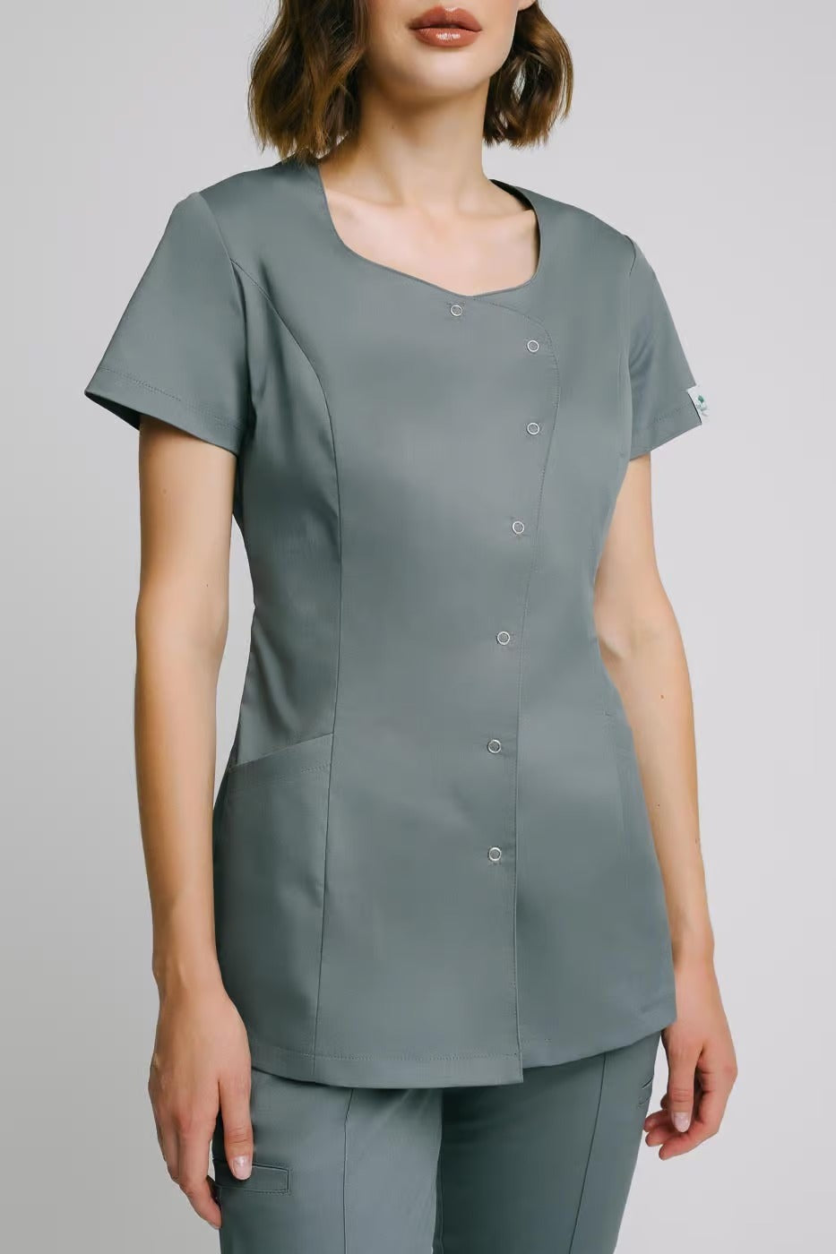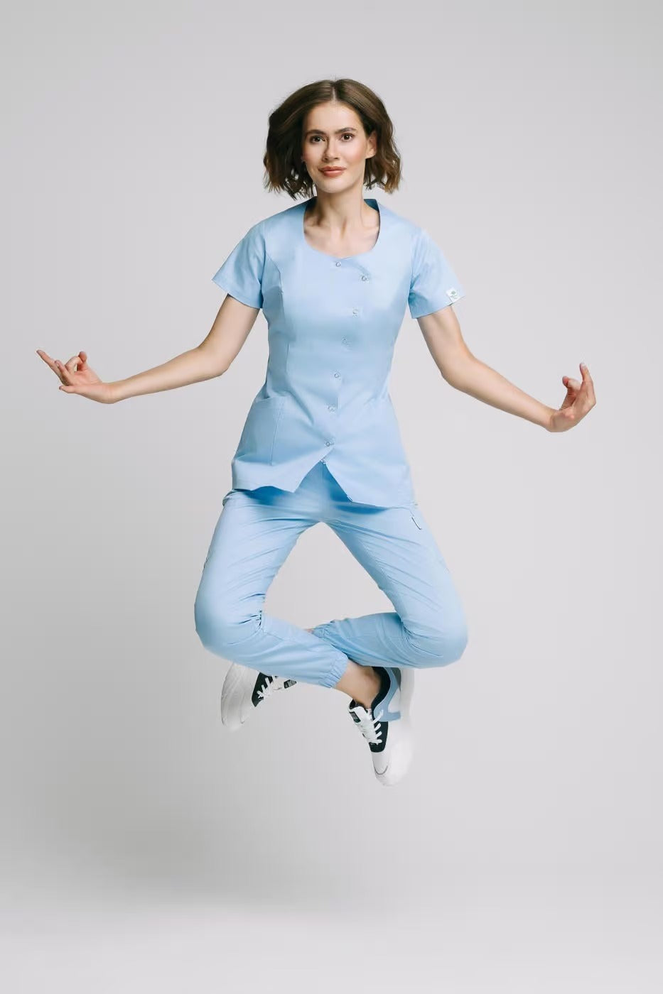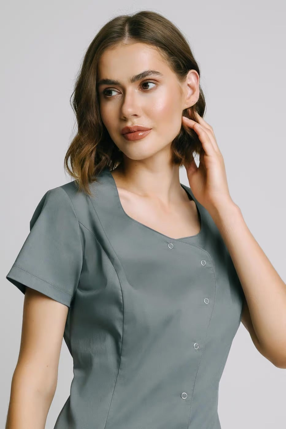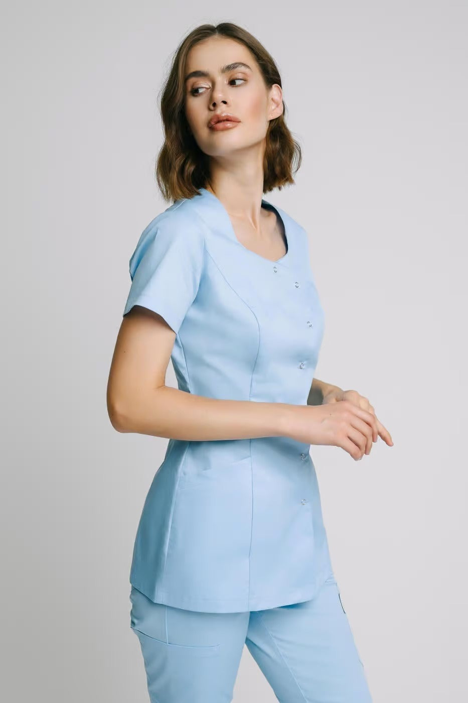 Fartuch medyczny model Claudia premium/+ jest uszyty z elastycznego, wytrzymałego materiału z wysoką zawartością splotów bawełny. Jeżeli poszukujesz fartucha w którym będziesz się czuła jak w scrubsie to idealne trafiłaś. Wersja premium tego modelu przede wszystkim jest elastyczna, posiada dwie duże kieszenie, dekolt w U, zapinany jest na napy. Fartuszek śmiało możesz prać w 60℃. Elastyczny materiał fartucha medycznego 'Claudia' wykorzystujemy już w naszych scrubsach medycznych model „Lena” oraz „Sonia” więc możesz dobrać pasujące spodnie z tych modeli. Dodatkiem świetnie uzupełniającym strój jest krótka frotka, którą możesz dokupić >tutaj<.