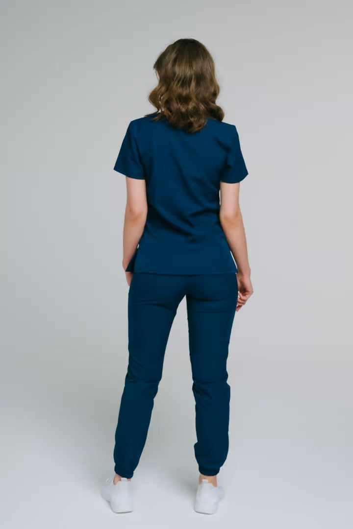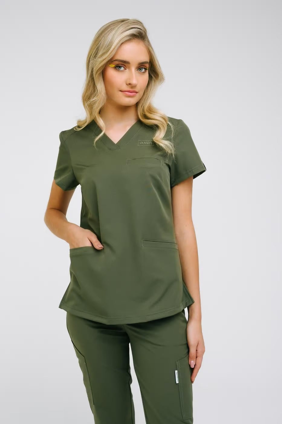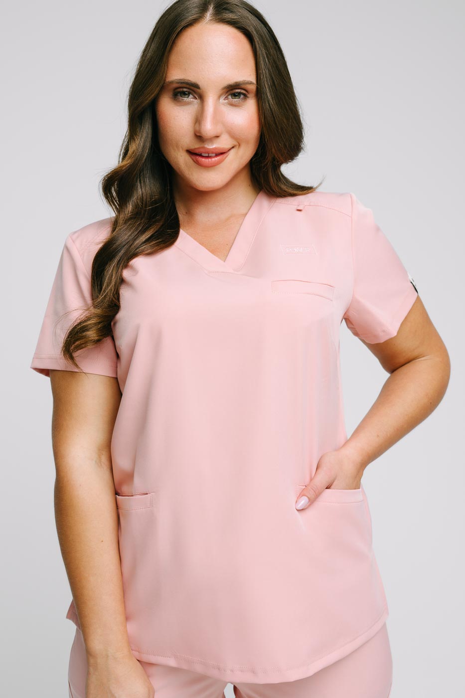 Bluza medyczna damska Natalie wykonana jest z lejącego, elastycznego w czterech kierunkach, chłodnego w dotyku materiału idealnego na ciepłe dni. Posiada trzy kieszenie, dekolt w serek, przeszycia na ramionach. Kieszenie są wpuszczone do środka, aby wyglądały elegancko i ekskluzywnie. Dookoła kieszeni w odległości 1mm poprowadzona jest drobna nić podkreślająca dopracowanie bluzy. Dekolt w literę V również wykończony jest subtelną nicią. Na ramionach występują skośne elementy optycznie wyszczuplające sylwetkę i zakończone specjalistycznym szyciem zwanym dwuigłówką. Ta sama podwójna nić użyta jest przy zakończeniach rękawków oraz na dole bluzy. Dzięki tak poprowadzonemu szyciu bluza jest niezwykle dopracowana i trwała. Dodatkowym elementem uzupełniającym cały look jest mała pętelka wszyta nad górną kieszenią, możesz do niej przypiąć np. identyfikator. Nasza bluza została wyposażona w zaszewki pasujące z tylu oraz na piersiach dzięki czemu idealnie dopasuje się do Twojego ciała i podkreśli jego atuty. Pęknięcia na boku bluzy zapewnią komfort podczas siadania.
