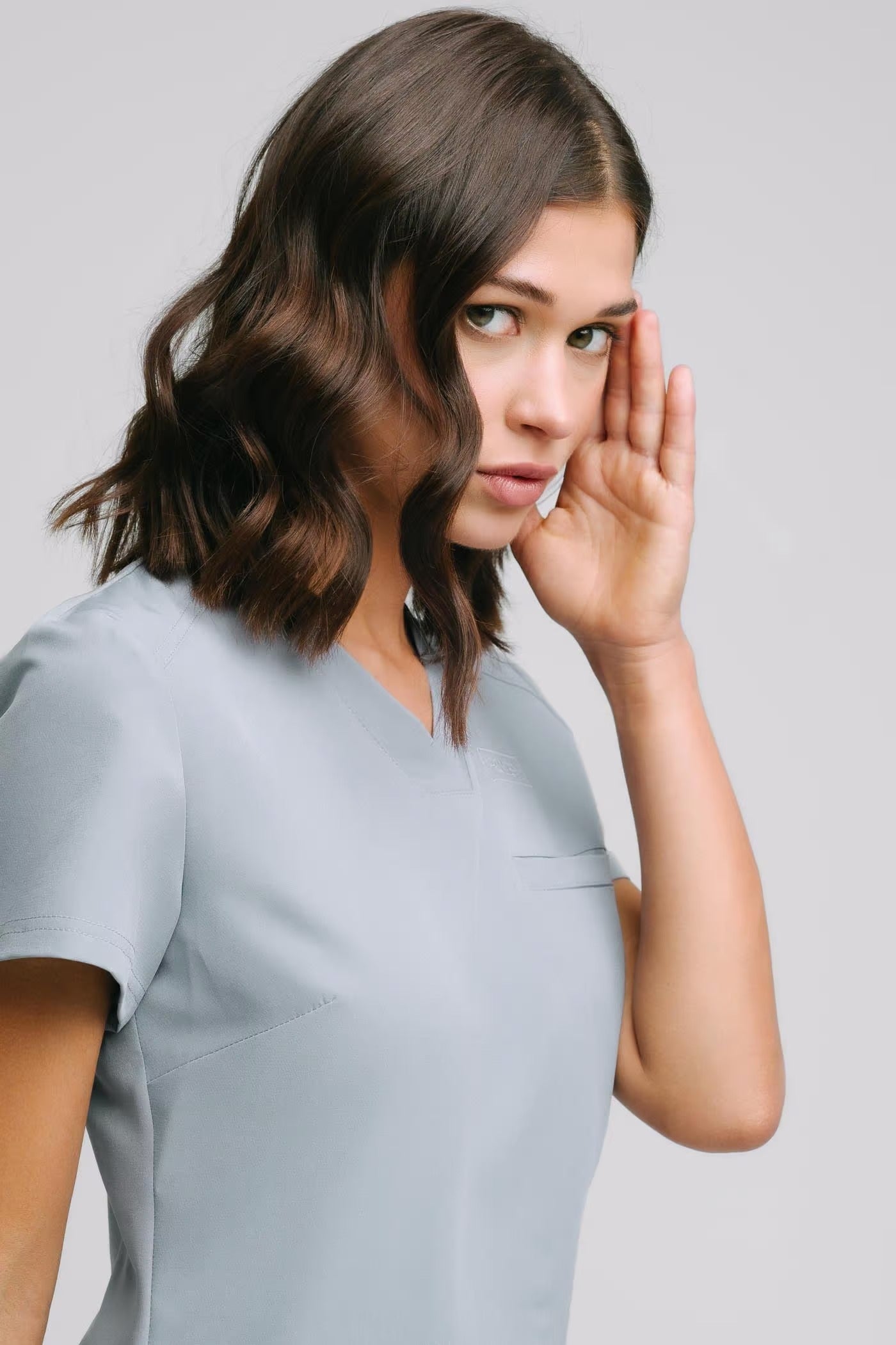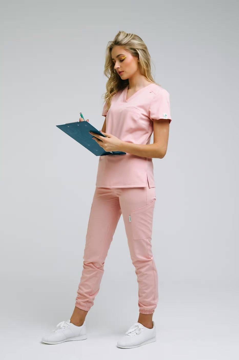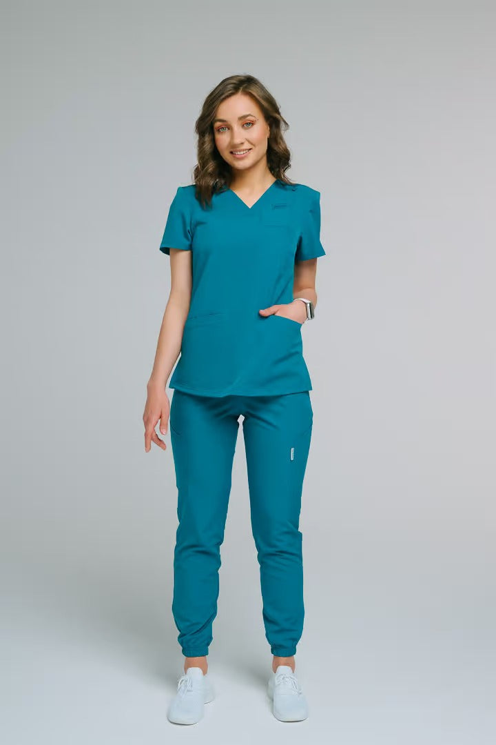 Bluza medyczna damska Natalie wykonana jest z lejącego, elastycznego w czterech kierunkach, chłodnego w dotyku materiału idealnego na ciepłe dni. Posiada trzy kieszenie, dekolt w serek, przeszycia na ramionach. Kieszenie są wpuszczone do środka, aby wyglądały elegancko i ekskluzywnie. Dookoła kieszeni w odległości 1mm poprowadzona jest drobna nić podkreślająca dopracowanie bluzy. Dekolt w literę V również wykończony jest subtelną nicią. Na ramionach występują skośne elementy optycznie wyszczuplające sylwetkę i zakończone specjalistycznym szyciem zwanym dwuigłówką. Ta sama podwójna nić użyta jest przy zakończeniach rękawków oraz na dole bluzy. Dzięki tak poprowadzonemu szyciu bluza jest niezwykle dopracowana i trwała. Dodatkowym elementem uzupełniającym cały look jest mała pętelka wszyta nad górną kieszenią, możesz do niej przypiąć np. identyfikator. Nasza bluza została wyposażona w zaszewki pasujące z tylu oraz na piersiach dzięki czemu idealnie dopasuje się do Twojego ciała i podkreśli jego atuty. Pęknięcia na boku bluzy zapewnią komfort podczas siadania.