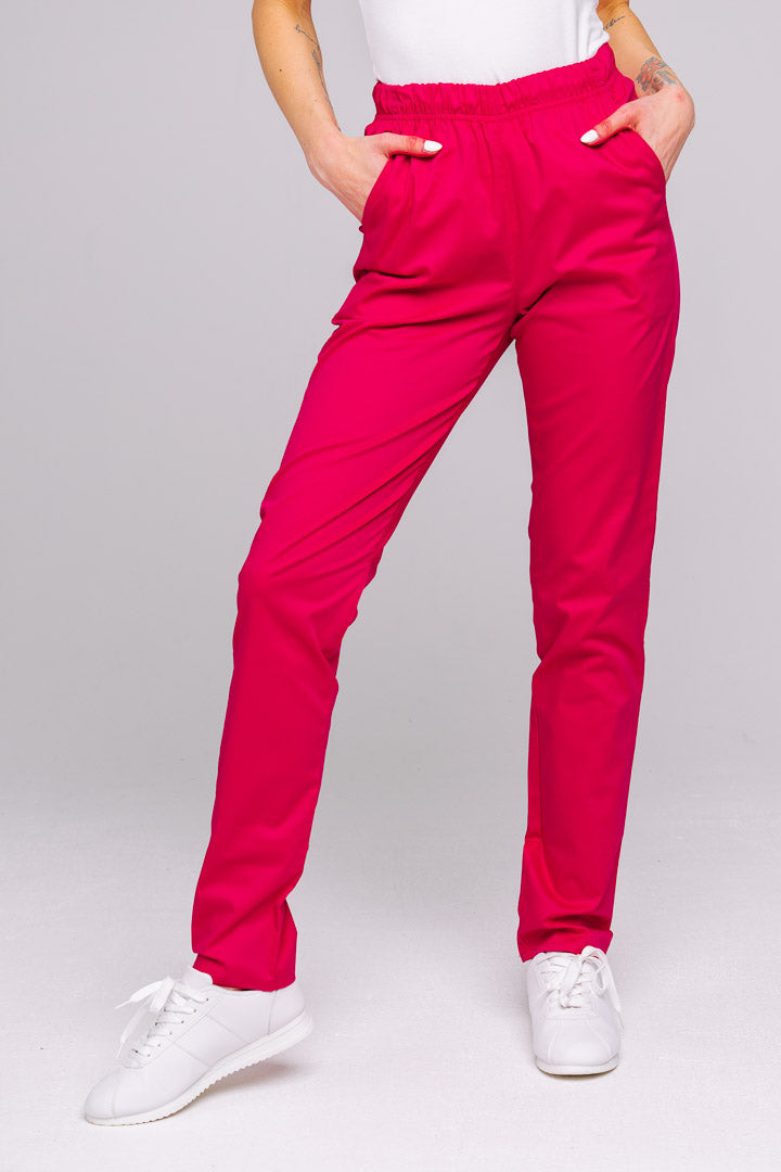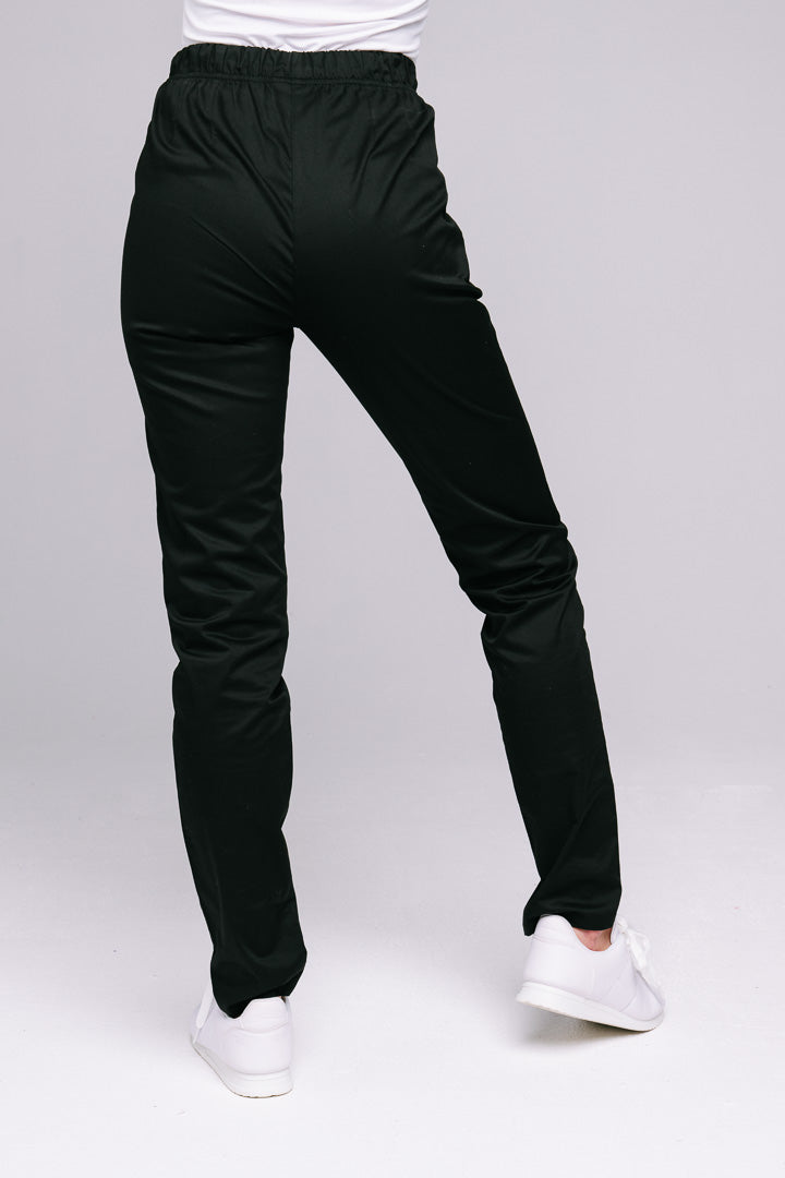 Spodnie medyczne unisex wykonane z elastycznego, trwałego materiału. Uniwersalny krój zapewnia zarówno kobietom jak i mężczyznom doskonały wygląd. Krój jest prosty ze zwężaną nogawką. W pasie dla wygody zastosowaliśmy gumę i sznurek od wewnętrznej strony spodni. Spodnie z przodu mają dwie kieszenie. Doskonale pasują do fartuchów jak i bluz.
