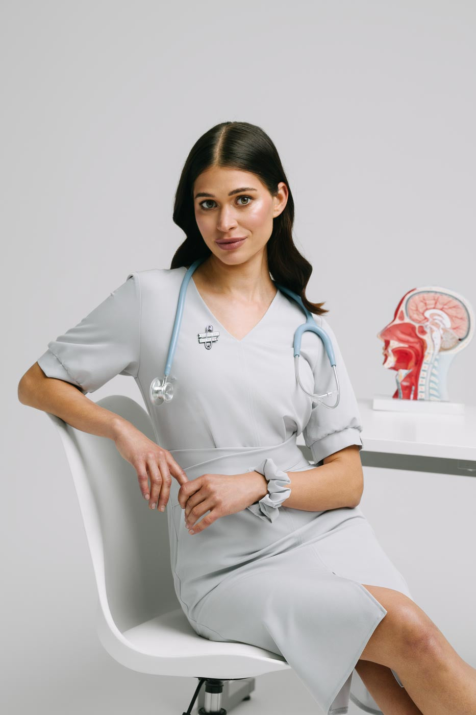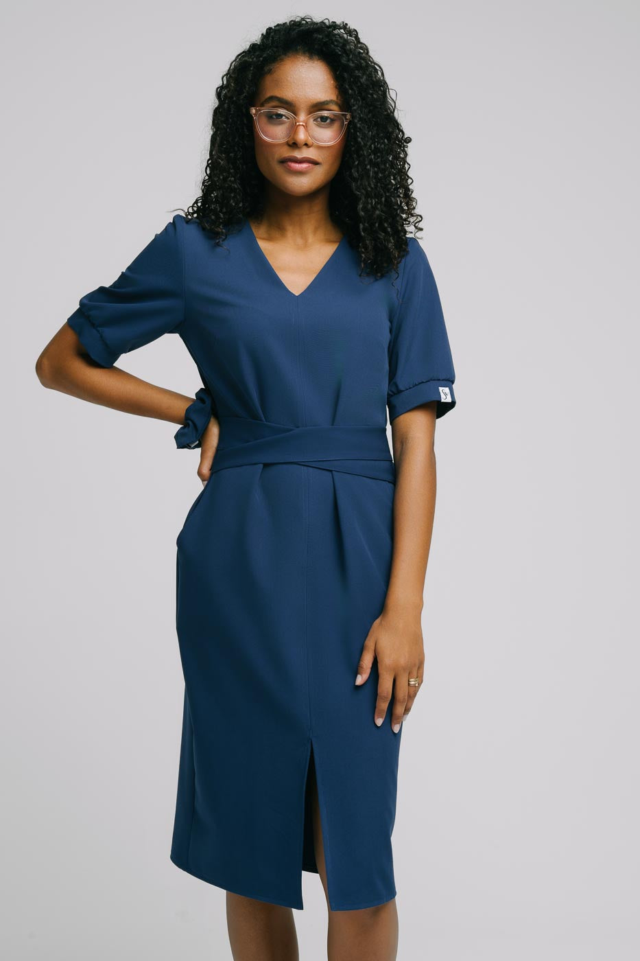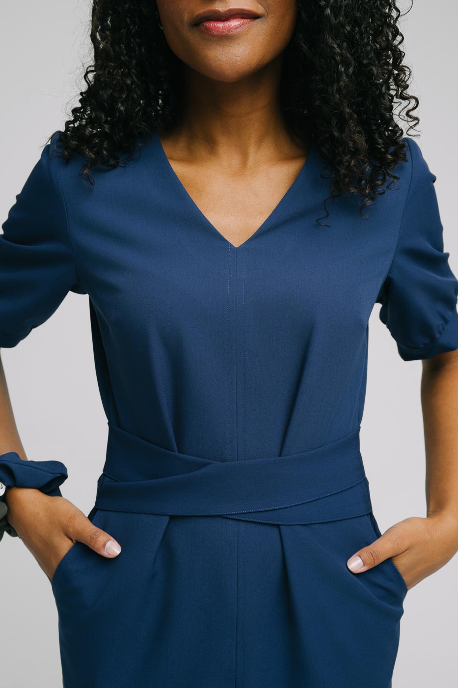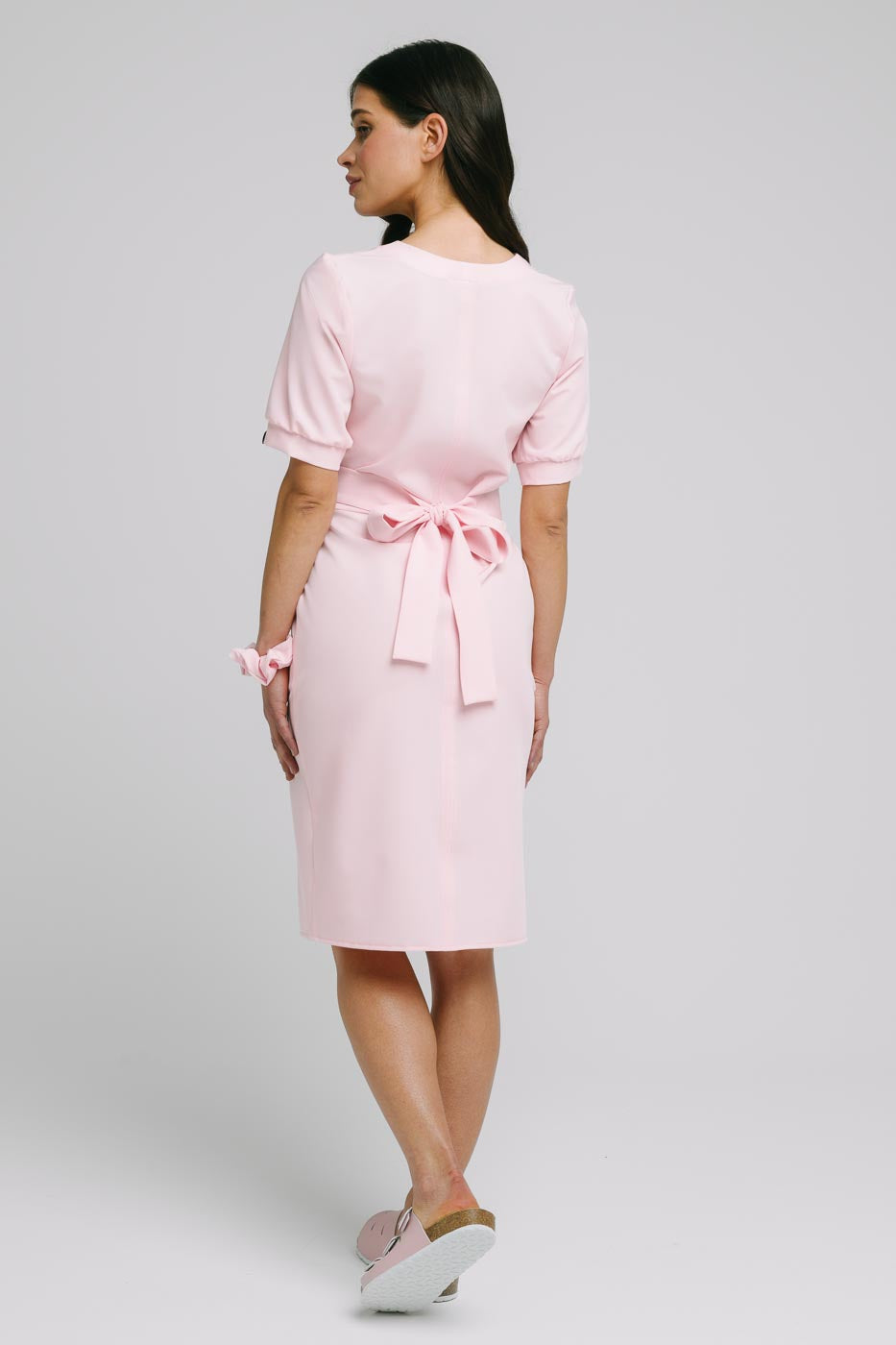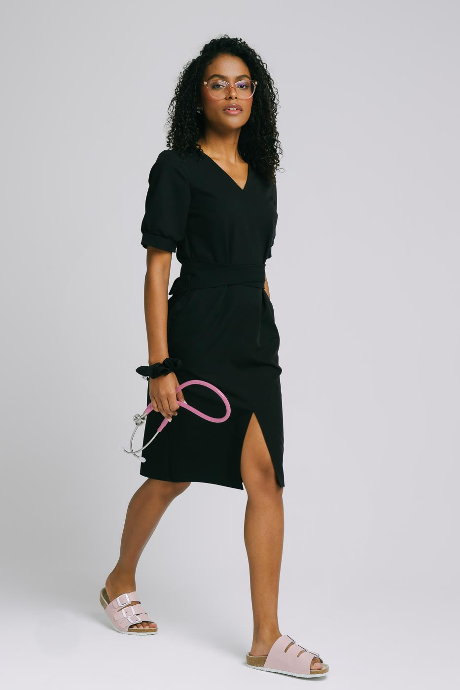 Bardzo kobieca, dodająca klasy i uroku sukienka medyczna Kate uszyta z wysokogatunkowej i miękkiej tkaniny “Viscon” z bogatą zawartością splotów wiskozy. Pracując w ochronie zdrowia lub branży beauty potrzebujesz sukienki medycznej w której będziesz się czuła komfortowo, kobieco i pięknie. Sukienka medyczna Kate idealnie spełni te potrzeby. Przy projektowaniu sukienki wygodę postawiliśmy na pierwszym miejscu! Sukienka jest wkładana przez głowę a dekolt wykończony w literę V.  Zadbaliśmy o profesjonalną długość midi. Projektując sukienkę testowaliśmy pęknięcie z przodu na wiele różnych sposobów: wbiegaliśmy po schodach, chodziliśmy dużymi szybkimi krokami, siadaliśmy na różnych wysokościach krzeseł, mierzyliśmy na wielu figurach i wysokościach kobiet i tak powstało idealnej długości rozcięcie z przodu sukienki. Rozcięcie jest zabezpieczone ryglem żebyś nie musiała się przejmować czy pękniecie nie “pójdzie” dalej.