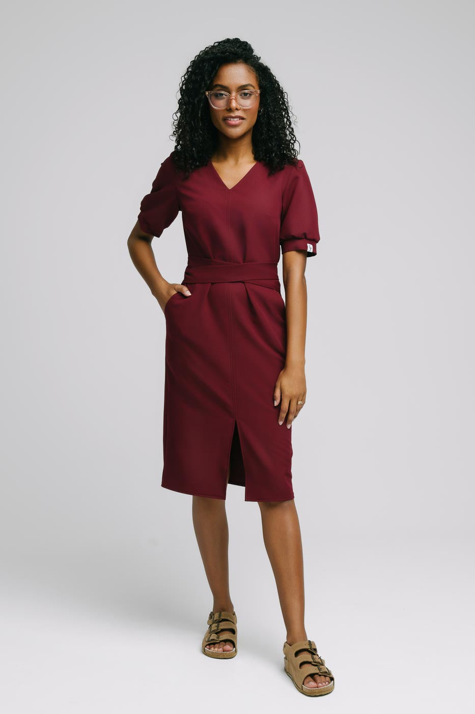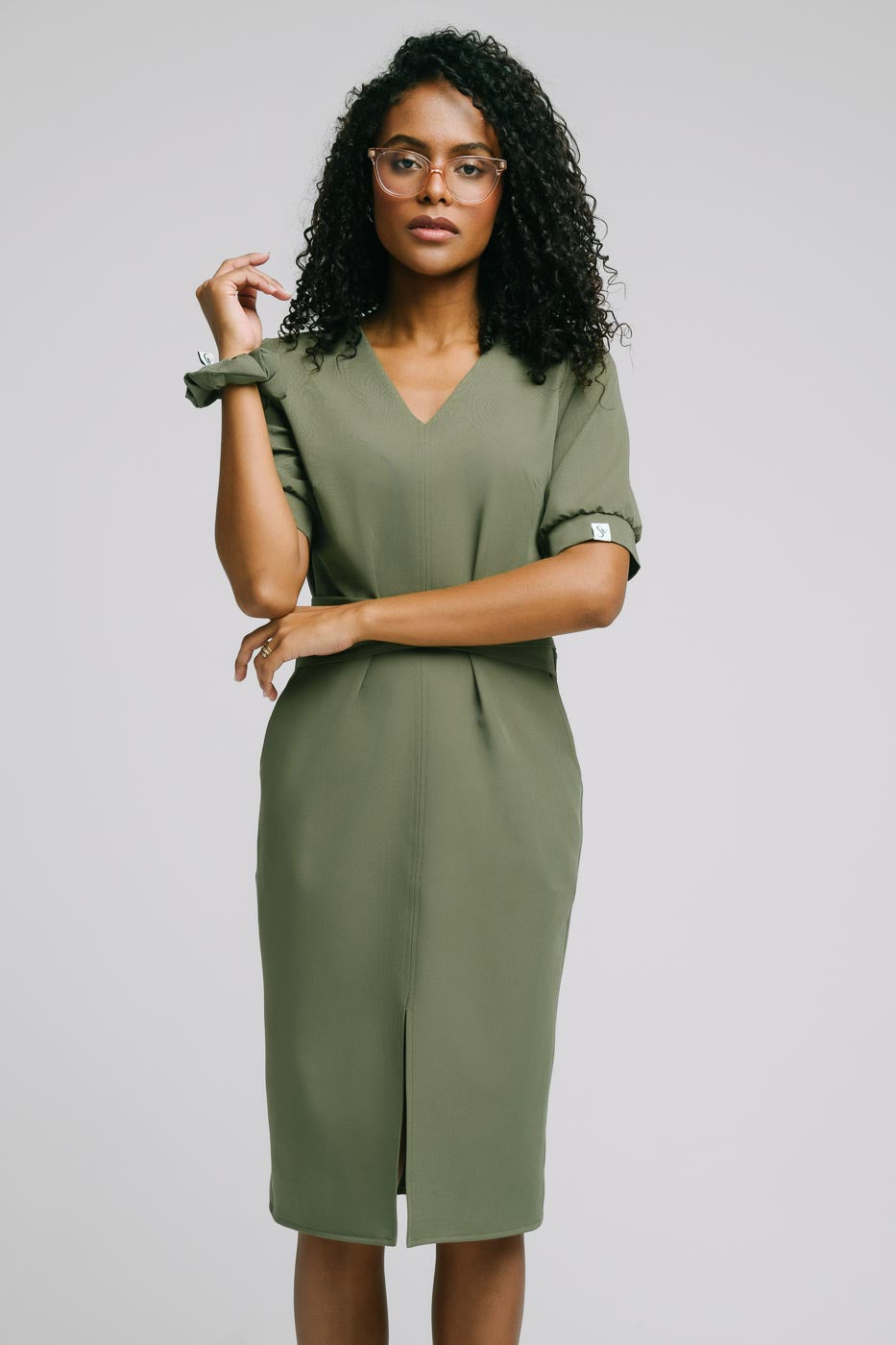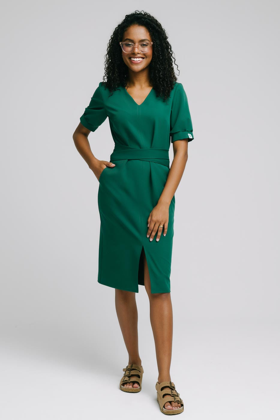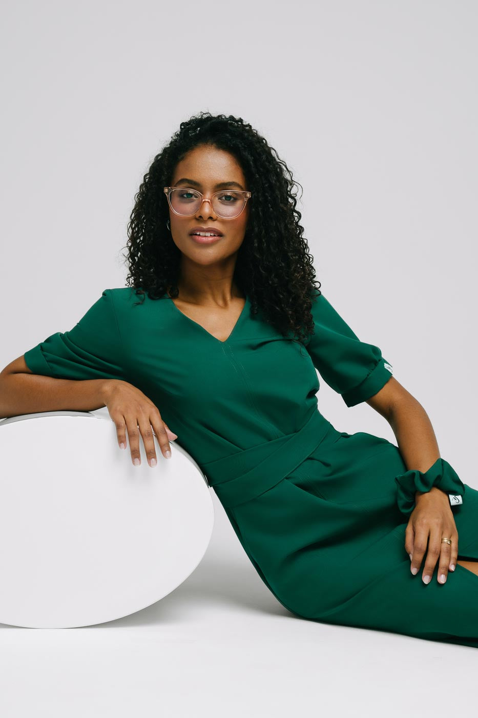 Bardzo kobieca, dodająca klasy i uroku sukienka medyczna Kate uszyta z wysokogatunkowej i miękkiej tkaniny “Viscon” z bogatą zawartością splotów wiskozy. Pracując w ochronie zdrowia lub branży beauty potrzebujesz sukienki medycznej w której będziesz się czuła komfortowo, kobieco i pięknie. Sukienka medyczna Kate idealnie spełni te potrzeby. Przy projektowaniu sukienki wygodę postawiliśmy na pierwszym miejscu! Sukienka jest wkładana przez głowę a dekolt wykończony w literę V.  Zadbaliśmy o profesjonalną długość midi. Projektując sukienkę testowaliśmy pęknięcie z przodu na wiele różnych sposobów: wbiegaliśmy po schodach, chodziliśmy dużymi szybkimi krokami, siadaliśmy na różnych wysokościach krzeseł, mierzyliśmy na wielu figurach i wysokościach kobiet i tak powstało idealnej długości rozcięcie z przodu sukienki. Rozcięcie jest zabezpieczone ryglem żebyś nie musiała się przejmować czy pękniecie nie “pójdzie” dalej.