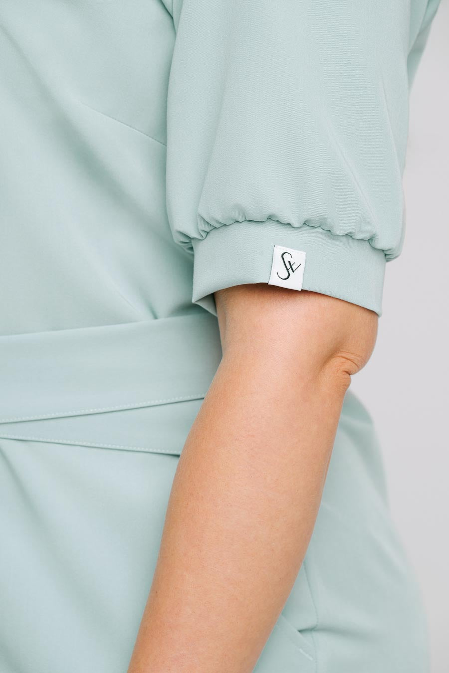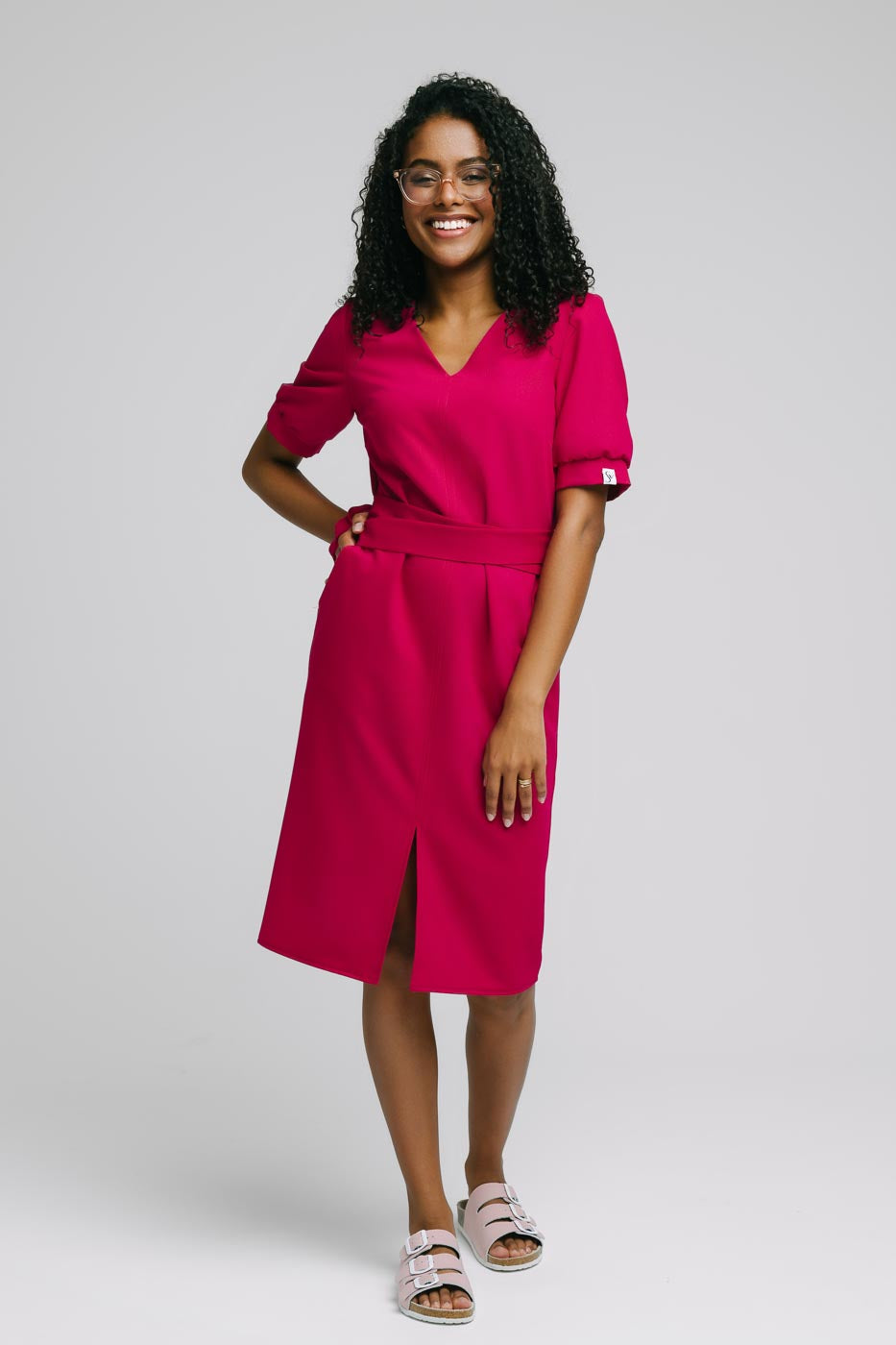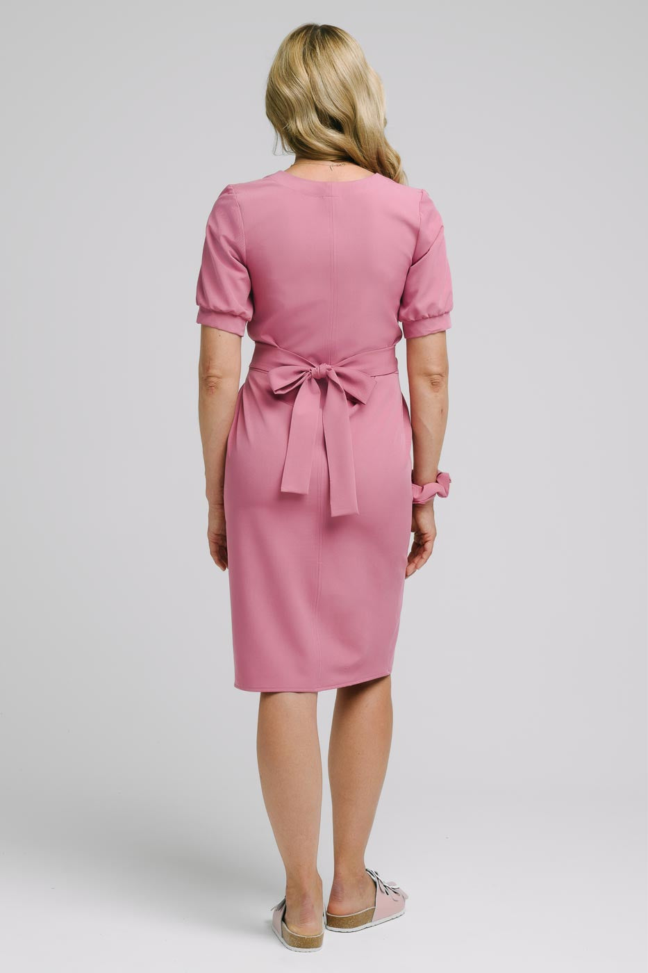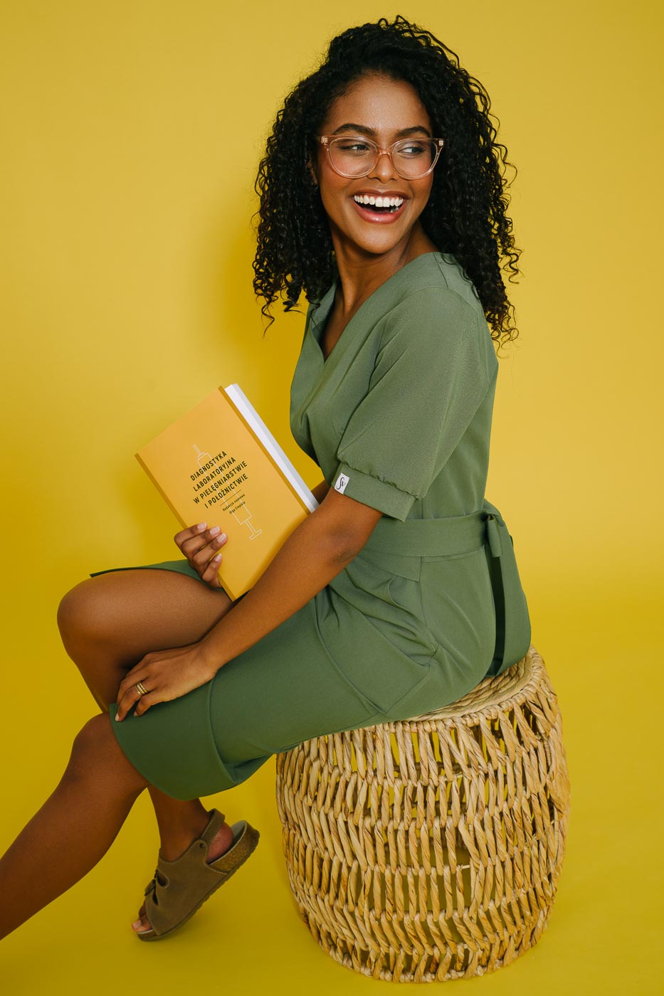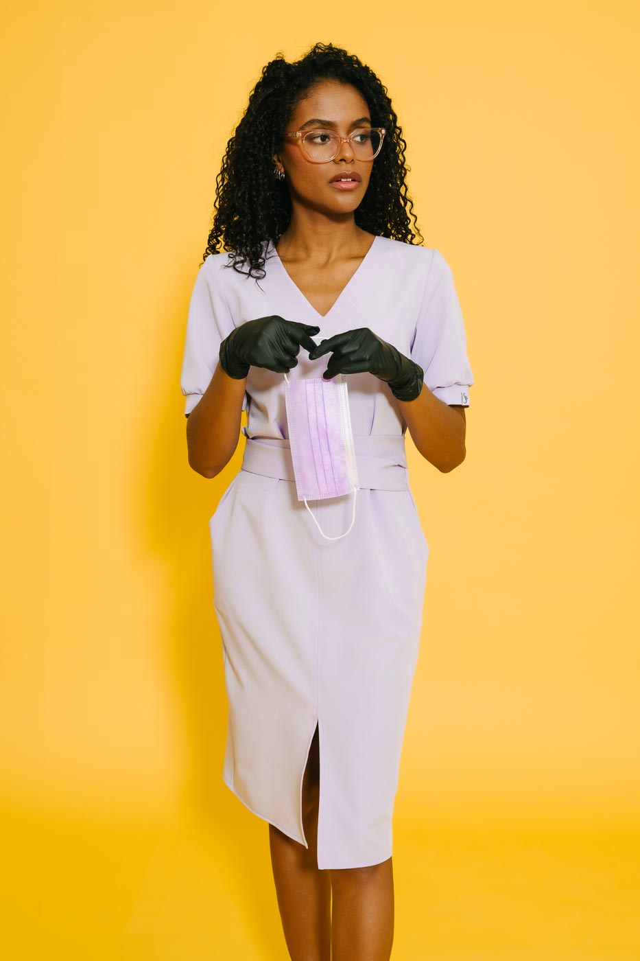 Bardzo kobieca, dodająca klasy i uroku sukienka medyczna Kate uszyta z wysokogatunkowej i miękkiej tkaniny “Viscon” z bogatą zawartością splotów wiskozy. Pracując w ochronie zdrowia lub branży beauty potrzebujesz sukienki medycznej w której będziesz się czuła komfortowo, kobieco i pięknie. Sukienka medyczna Kate idealnie spełni te potrzeby. Przy projektowaniu sukienki wygodę postawiliśmy na pierwszym miejscu! Sukienka jest wkładana przez głowę a dekolt wykończony w literę V.  Zadbaliśmy o profesjonalną długość midi. Projektując sukienkę testowaliśmy pęknięcie z przodu na wiele różnych sposobów: wbiegaliśmy po schodach, chodziliśmy dużymi szybkimi krokami, siadaliśmy na różnych wysokościach krzeseł, mierzyliśmy na wielu figurach i wysokościach kobiet i tak powstało idealnej długości rozcięcie z przodu sukienki. Rozcięcie jest zabezpieczone ryglem żebyś nie musiała się przejmować czy pękniecie nie “pójdzie” dalej.