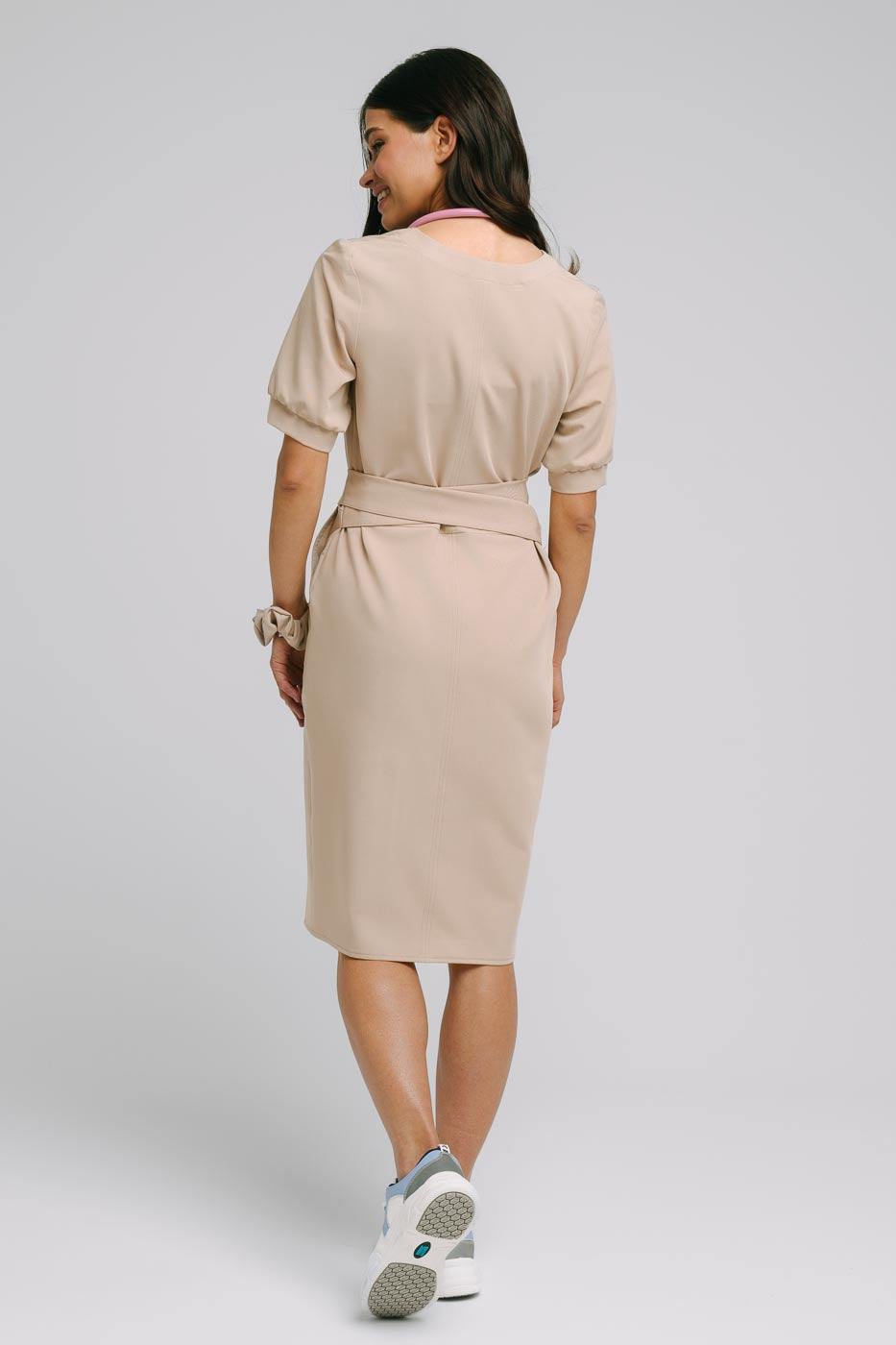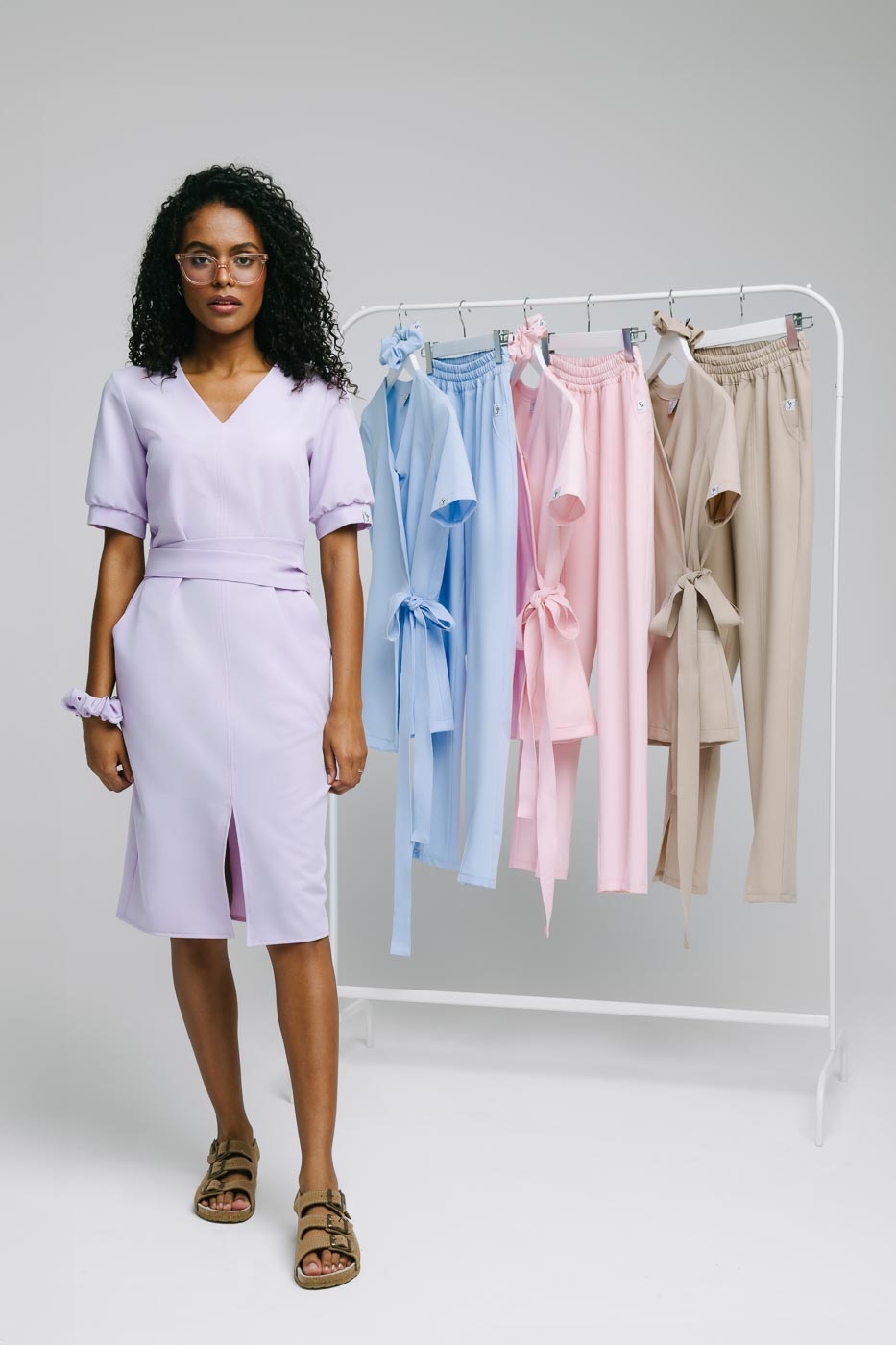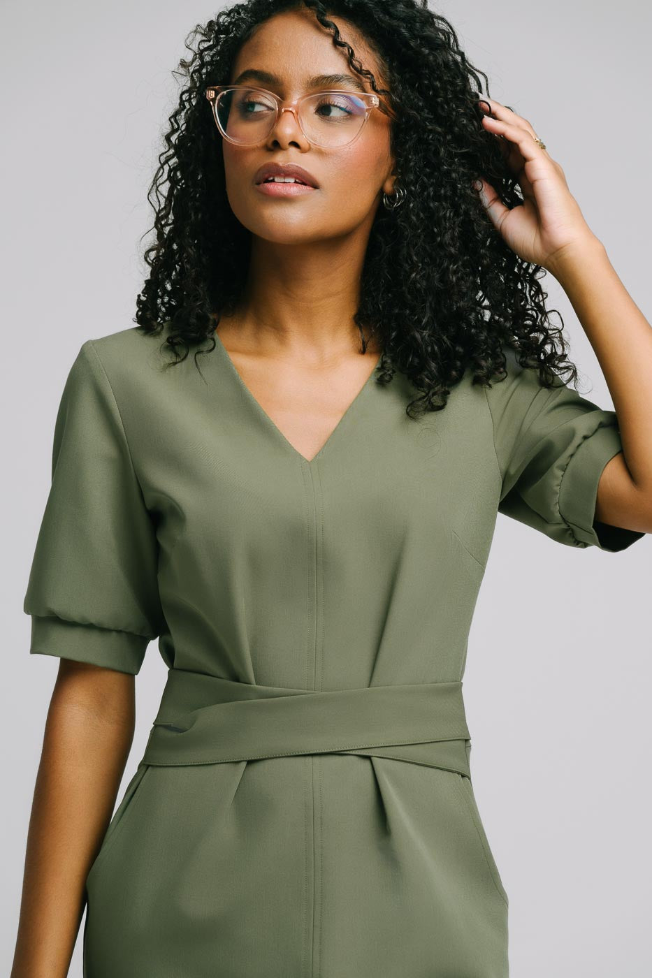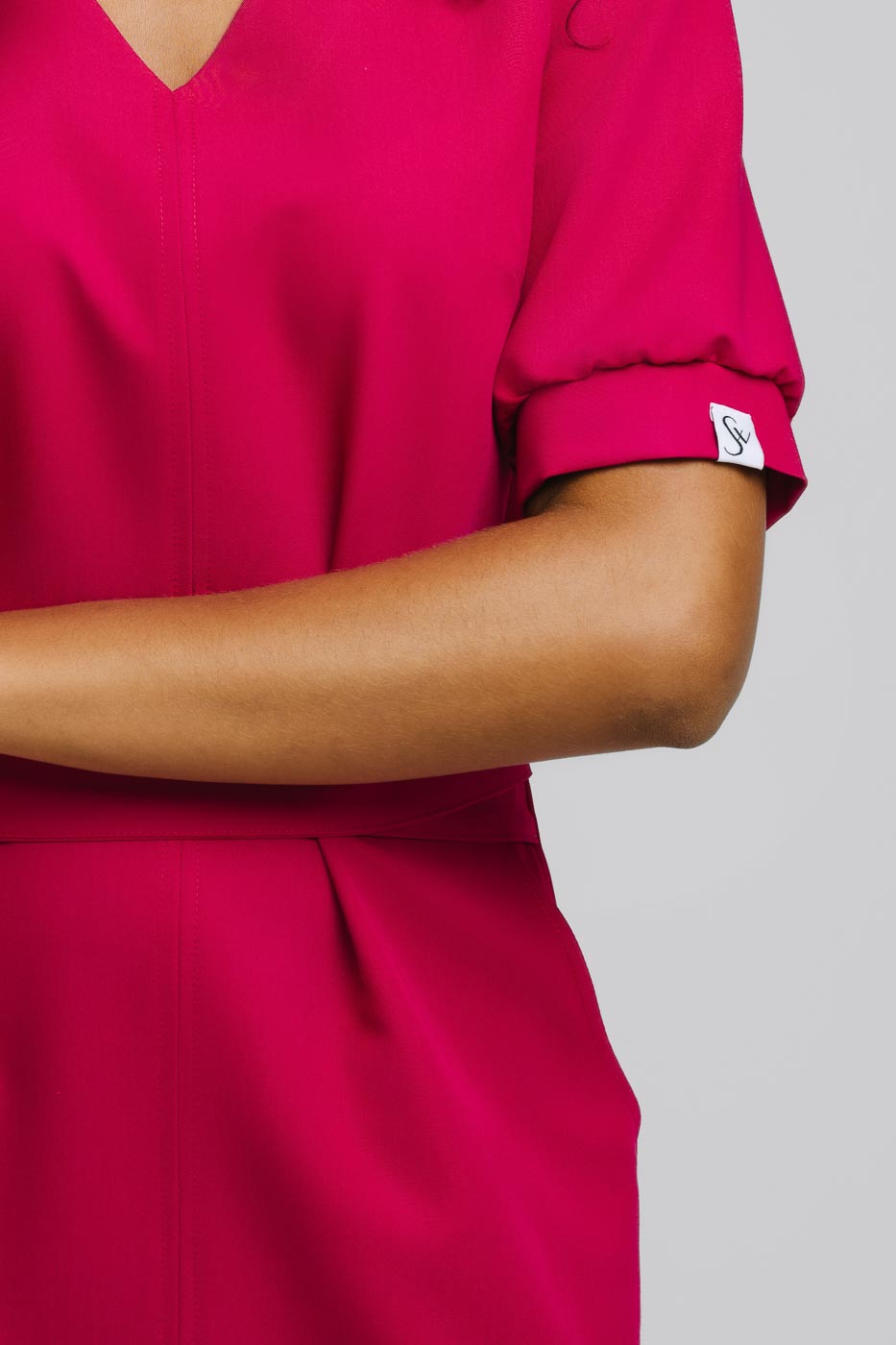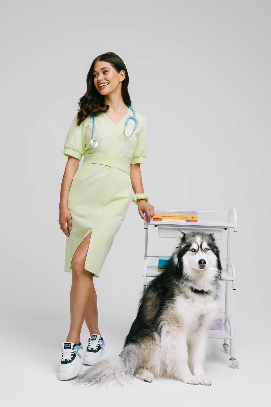 Bardzo kobieca, dodająca klasy i uroku sukienka medyczna Kate uszyta z wysokogatunkowej i miękkiej tkaniny “Viscon” z bogatą zawartością splotów wiskozy. Pracując w ochronie zdrowia lub branży beauty potrzebujesz sukienki medycznej w której będziesz się czuła komfortowo, kobieco i pięknie. Sukienka medyczna Kate idealnie spełni te potrzeby. Przy projektowaniu sukienki wygodę postawiliśmy na pierwszym miejscu! Sukienka jest wkładana przez głowę a dekolt wykończony w literę V.  Zadbaliśmy o profesjonalną długość midi. Projektując sukienkę testowaliśmy pęknięcie z przodu na wiele różnych sposobów: wbiegaliśmy po schodach, chodziliśmy dużymi szybkimi krokami, siadaliśmy na różnych wysokościach krzeseł, mierzyliśmy na wielu figurach i wysokościach kobiet i tak powstało idealnej długości rozcięcie z przodu sukienki. Rozcięcie jest zabezpieczone ryglem żebyś nie musiała się przejmować czy pękniecie nie “pójdzie” dalej.