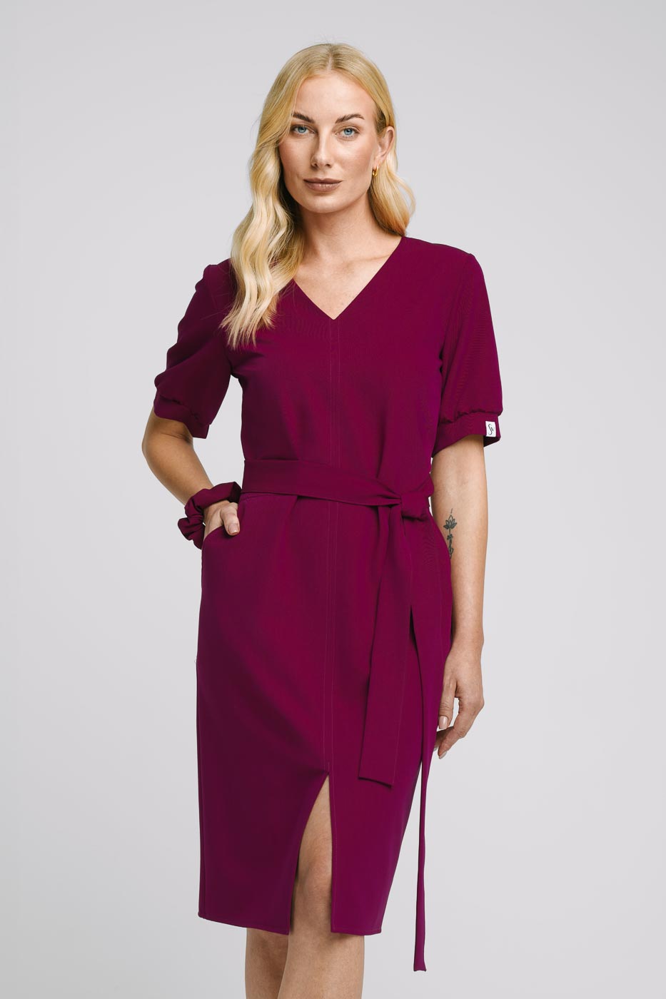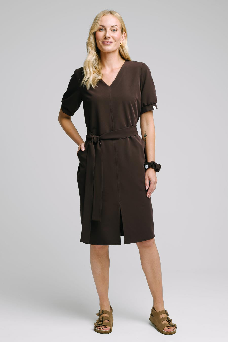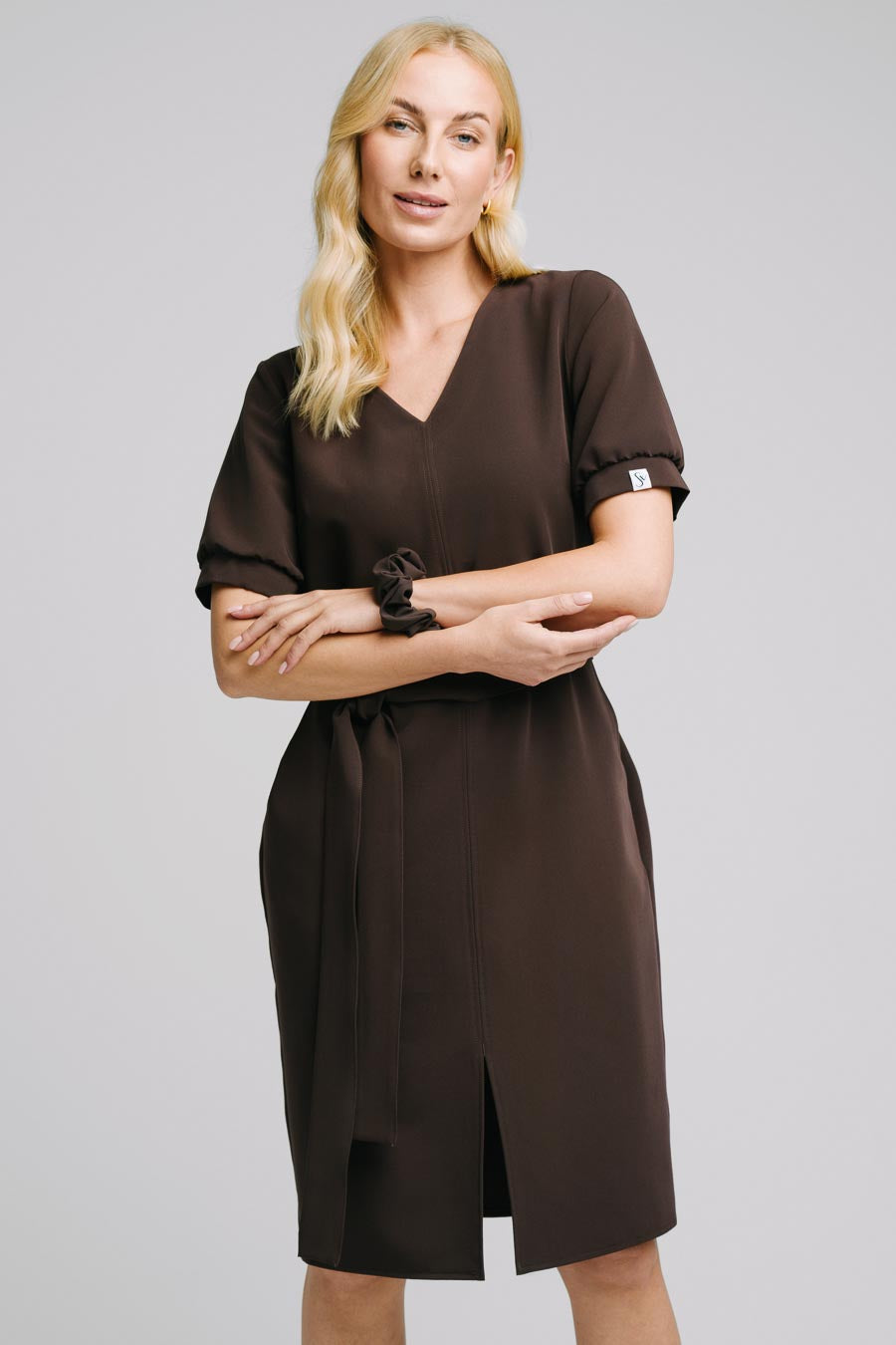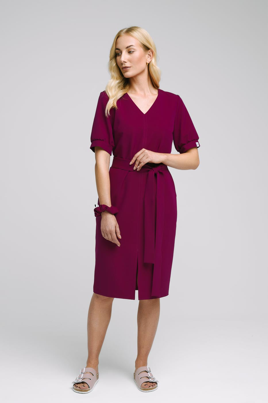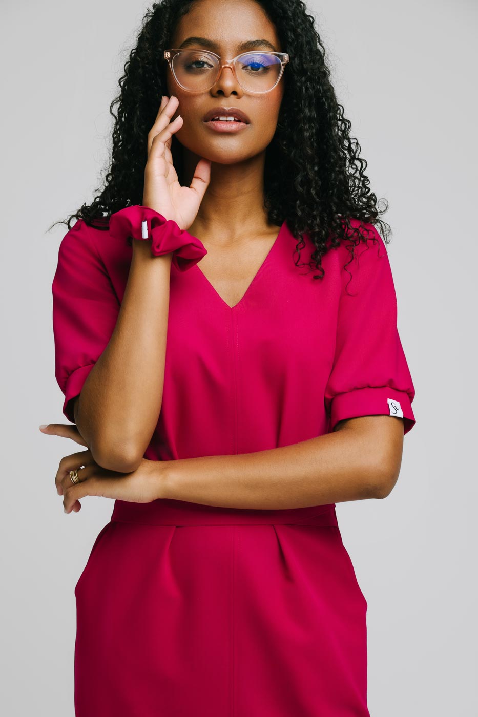 Bardzo kobieca, dodająca klasy i uroku sukienka medyczna Kate uszyta z wysokogatunkowej i miękkiej tkaniny “Viscon” z bogatą zawartością splotów wiskozy. Pracując w ochronie zdrowia lub branży beauty potrzebujesz sukienki medycznej w której będziesz się czuła komfortowo, kobieco i pięknie. Sukienka medyczna Kate idealnie spełni te potrzeby. Przy projektowaniu sukienki wygodę postawiliśmy na pierwszym miejscu! Sukienka jest wkładana przez głowę a dekolt wykończony w literę V.  Zadbaliśmy o profesjonalną długość midi. Projektując sukienkę testowaliśmy pęknięcie z przodu na wiele różnych sposobów: wbiegaliśmy po schodach, chodziliśmy dużymi szybkimi krokami, siadaliśmy na różnych wysokościach krzeseł, mierzyliśmy na wielu figurach i wysokościach kobiet i tak powstało idealnej długości rozcięcie z przodu sukienki. Rozcięcie jest zabezpieczone ryglem żebyś nie musiała się przejmować czy pękniecie nie “pójdzie” dalej.