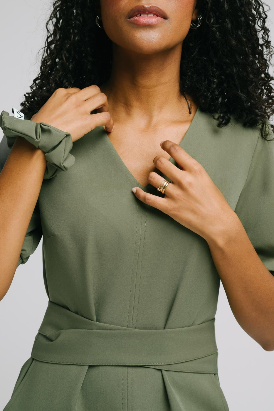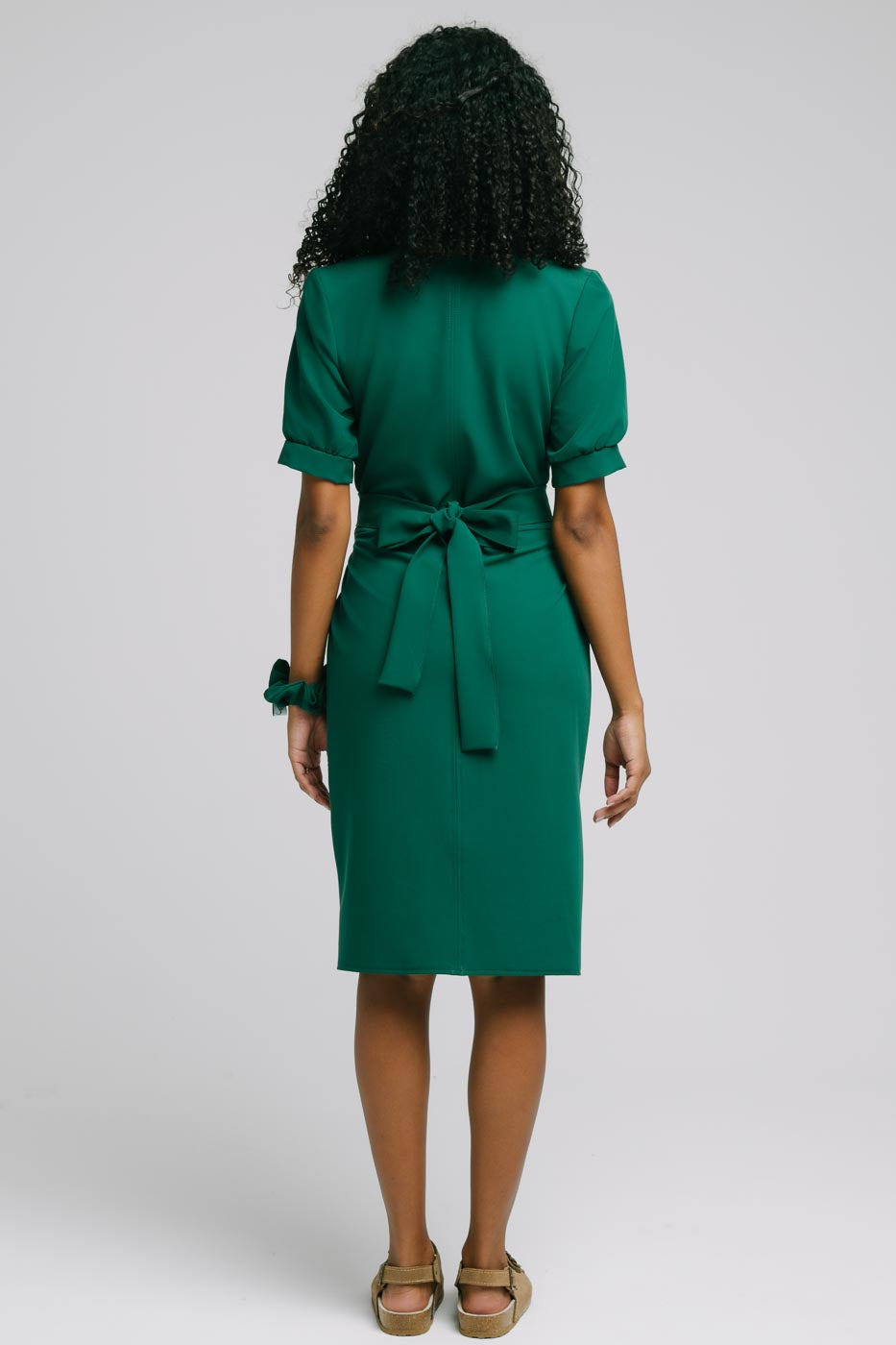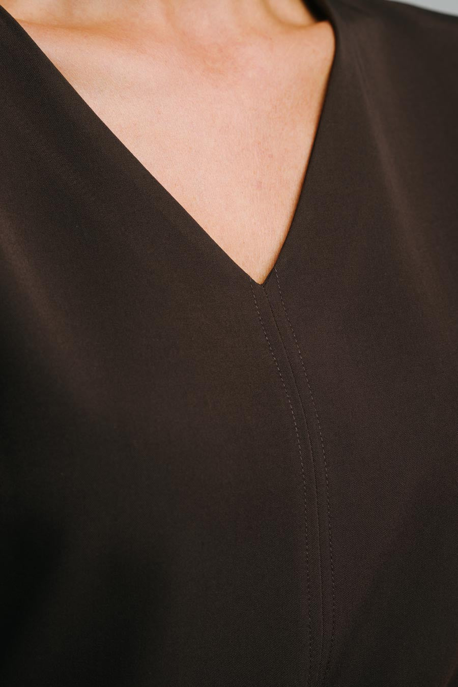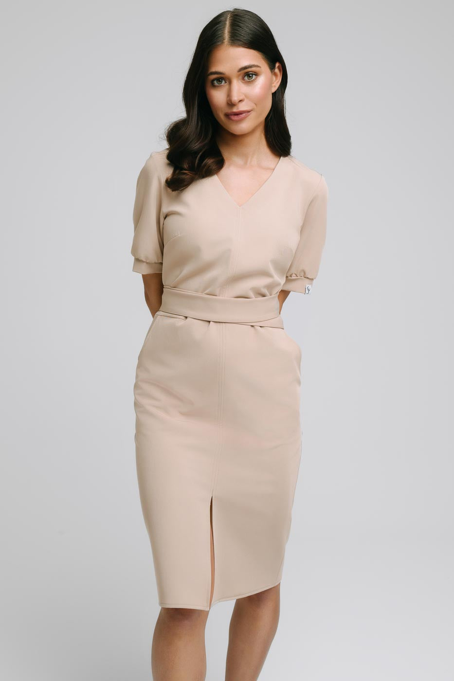 Bardzo kobieca, dodająca klasy i uroku sukienka medyczna Kate uszyta z wysokogatunkowej i miękkiej tkaniny “Viscon” z bogatą zawartością splotów wiskozy. Pracując w ochronie zdrowia lub branży beauty potrzebujesz sukienki medycznej w której będziesz się czuła komfortowo, kobieco i pięknie. Sukienka medyczna Kate idealnie spełni te potrzeby. Przy projektowaniu sukienki wygodę postawiliśmy na pierwszym miejscu! Sukienka jest wkładana przez głowę a dekolt wykończony w literę V.  Zadbaliśmy o profesjonalną długość midi. Projektując sukienkę testowaliśmy pęknięcie z przodu na wiele różnych sposobów: wbiegaliśmy po schodach, chodziliśmy dużymi szybkimi krokami, siadaliśmy na różnych wysokościach krzeseł, mierzyliśmy na wielu figurach i wysokościach kobiet i tak powstało idealnej długości rozcięcie z przodu sukienki. Rozcięcie jest zabezpieczone ryglem żebyś nie musiała się przejmować czy pękniecie nie “pójdzie” dalej.