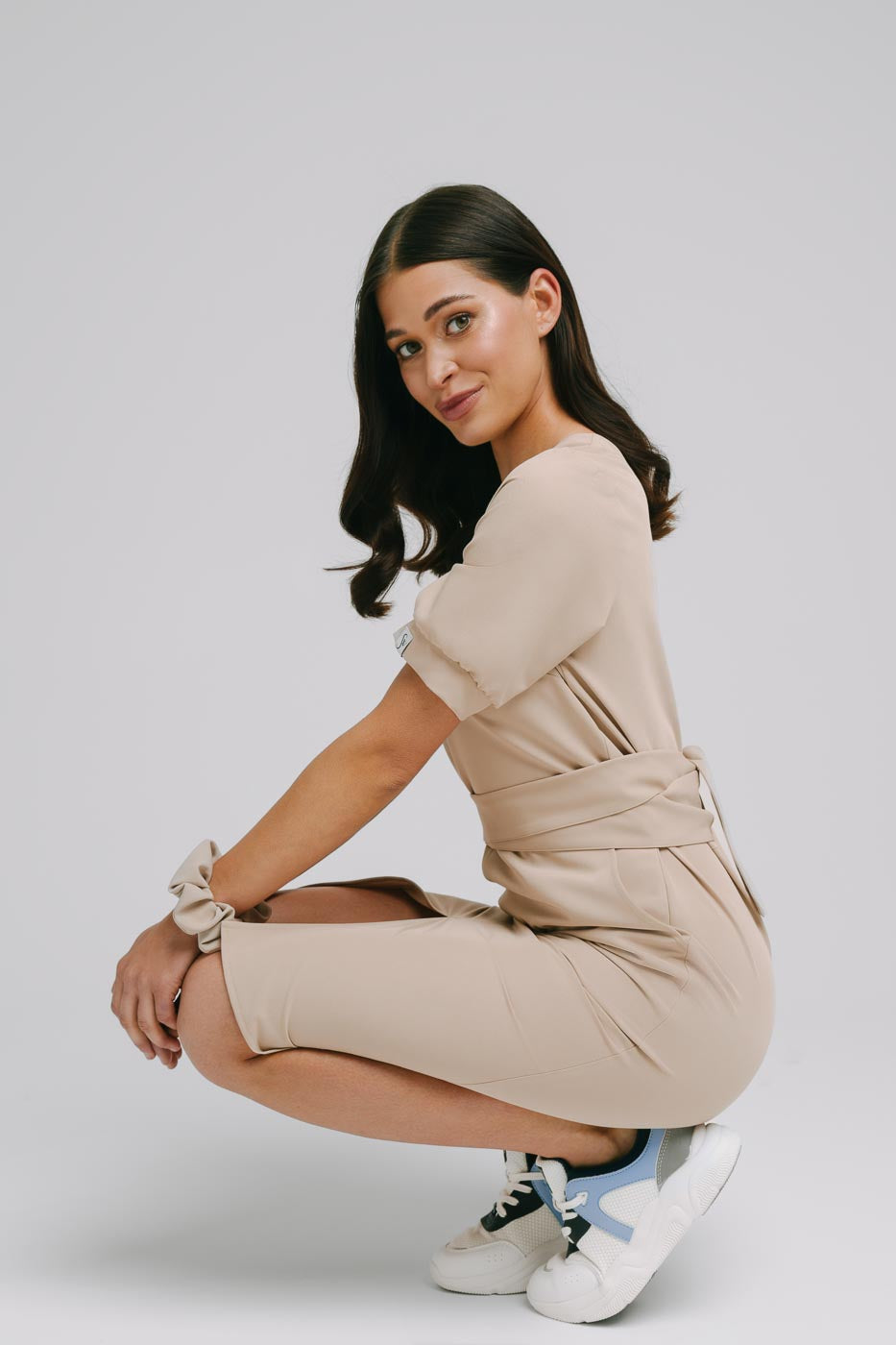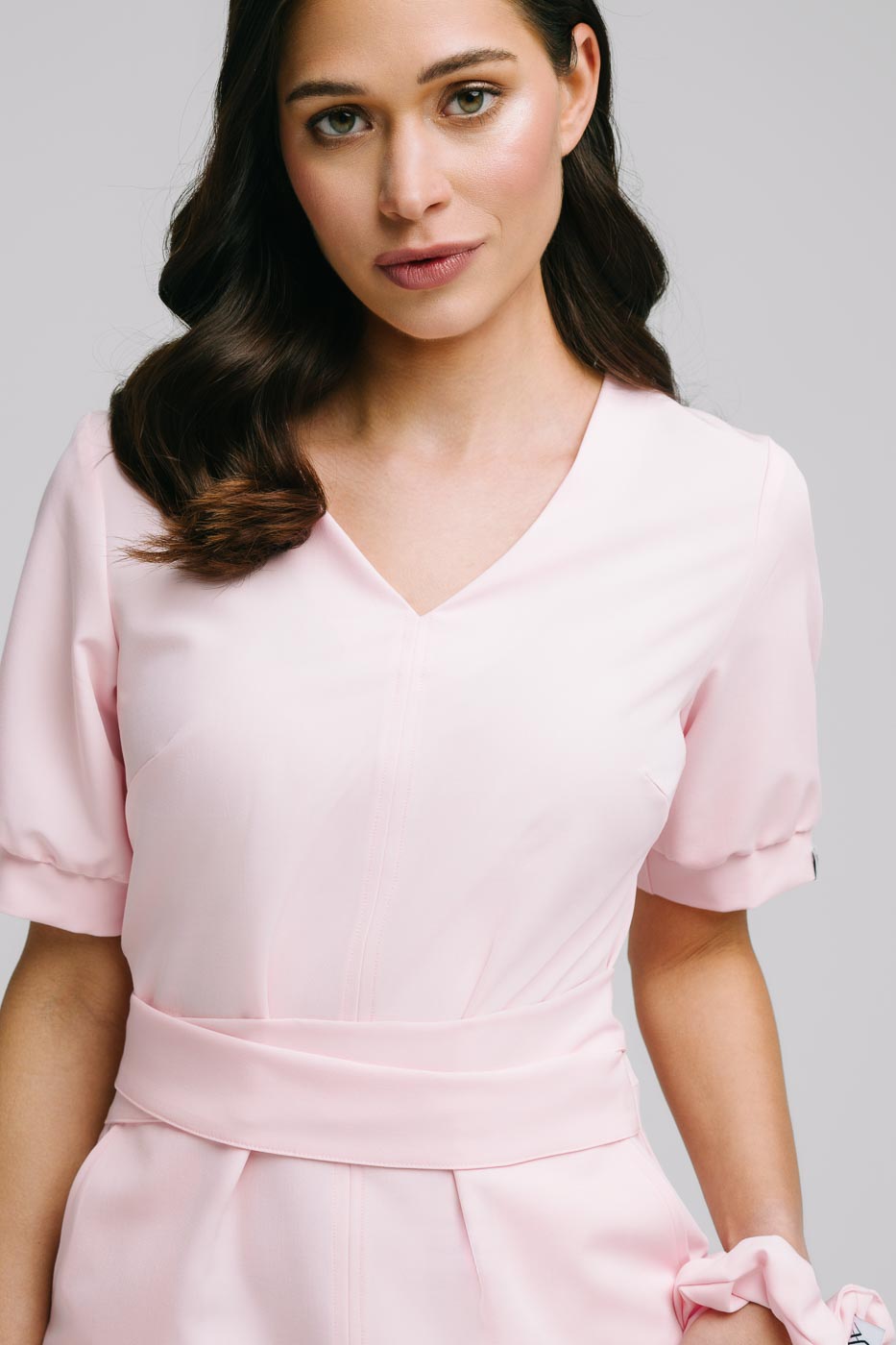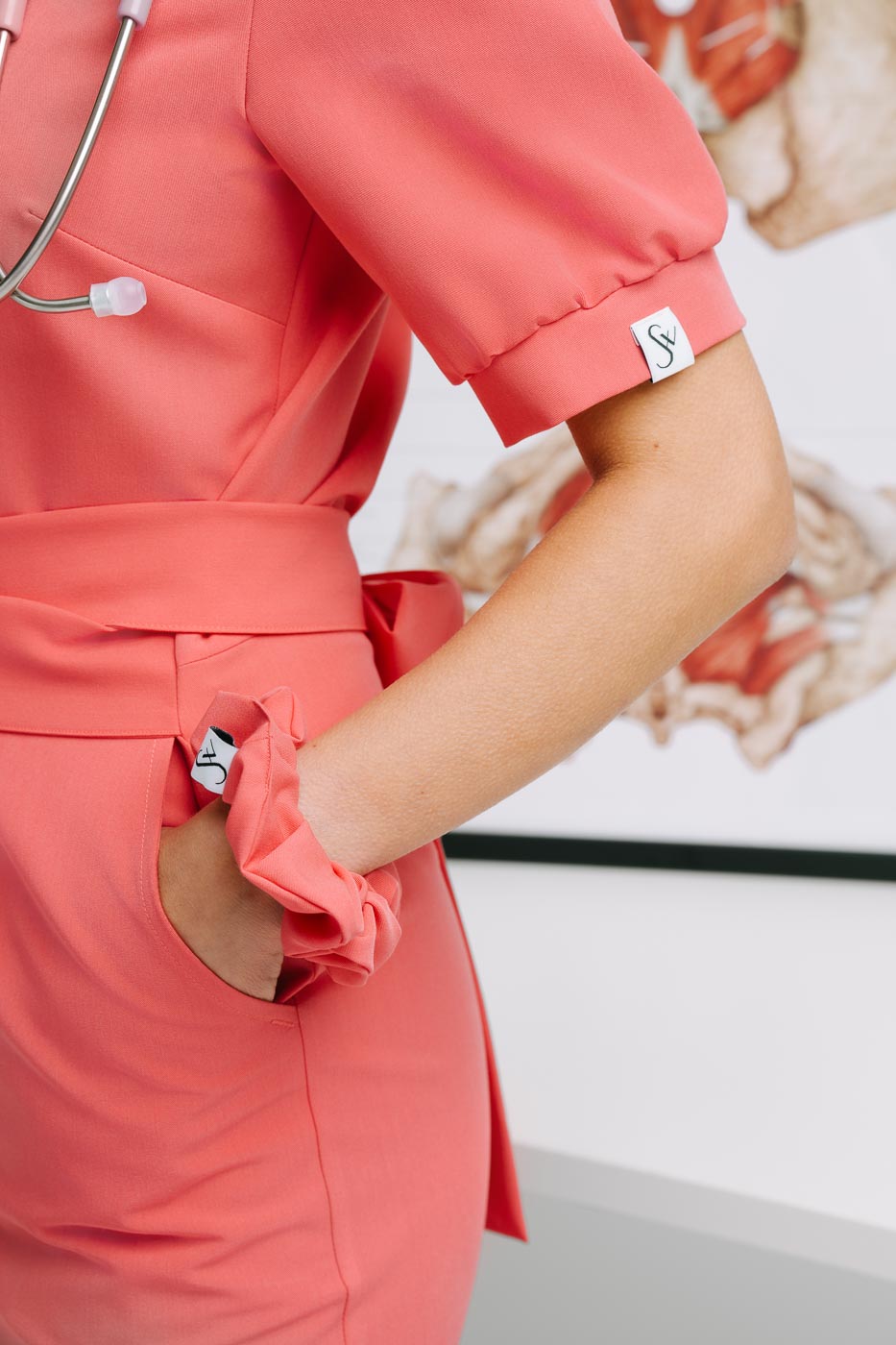 Lubisz sama decydować jak w danym dniu podkreślisz swoją talię? Rozwiązanie które posiada sukienka medyczna Kate idealnie się dla Ciebie sprawdzi! Paski wszyte na bokach sukienki pozwolą Ci zawiązać sukienkę na 2 różne sposoby z przodu lub z tyłu. To Ty decydujesz jak mocno ściśniesz pasek w talii oraz jak go dzisiaj ułożysz! Nosisz różne przedmioty w kieszeniach? Dla sukienki Kate to żaden problem! Znajdziesz w niej dwie duże kieszenie usytuowane na biodrach. Looku kobiecości i delikatności dodadzą ci rękawki z delikatnym marszczeniem. Jest to detal który skradnie Twoje serce i poczujesz się jak dama.
