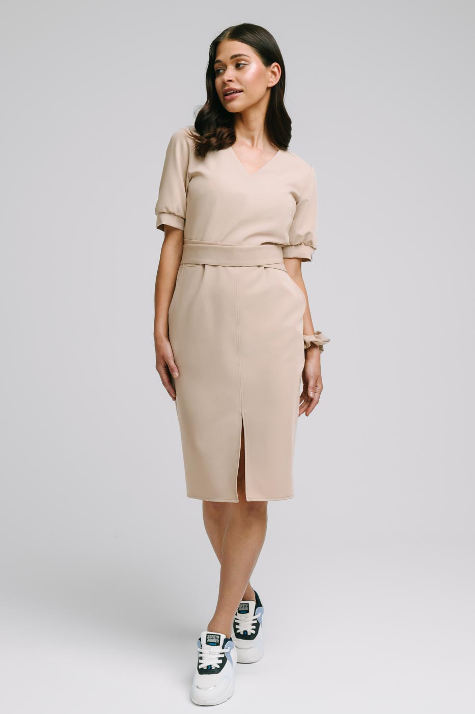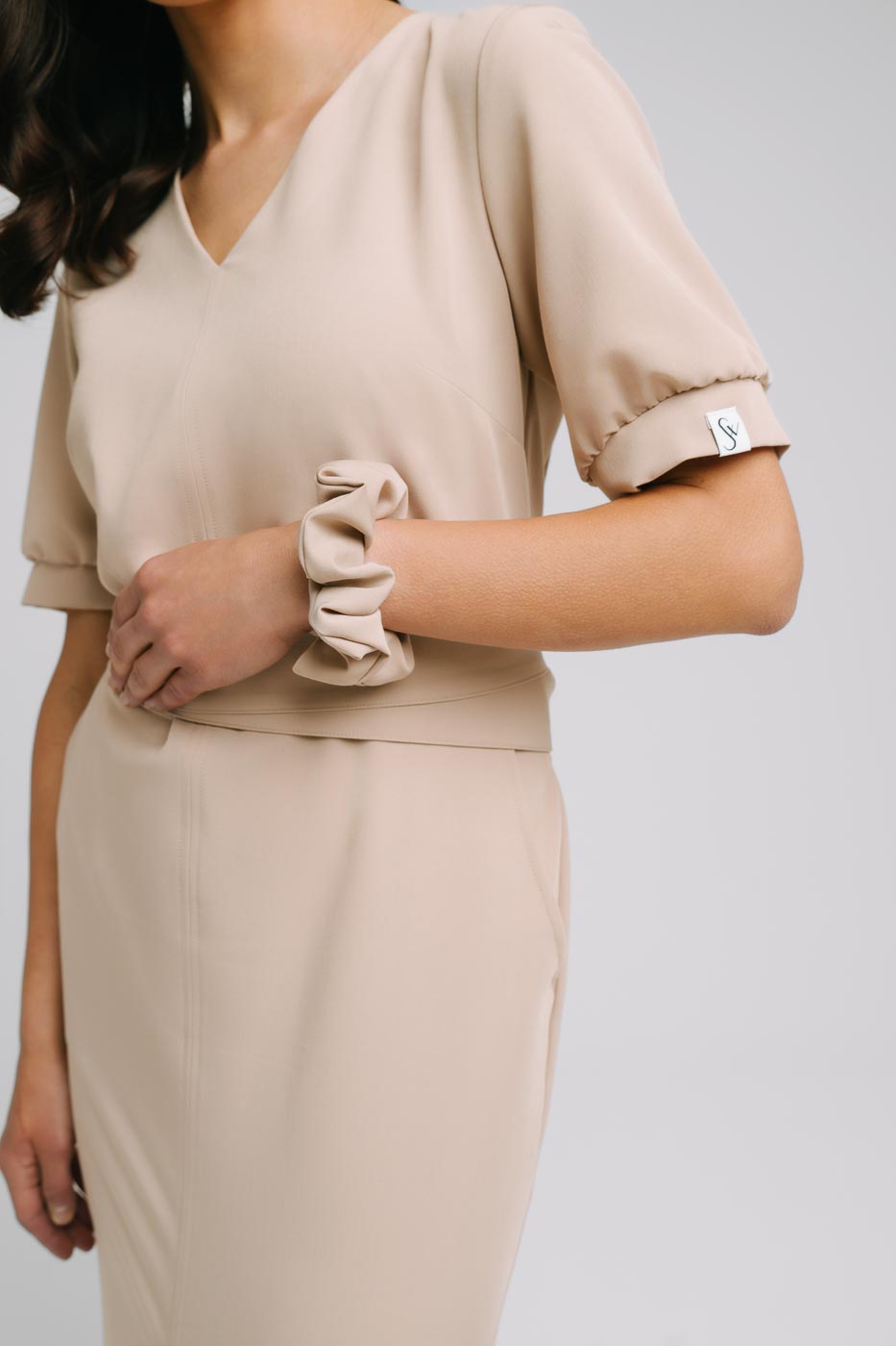 • Ozdobne przeszycie oraz pęknięcie na froncie sukienki