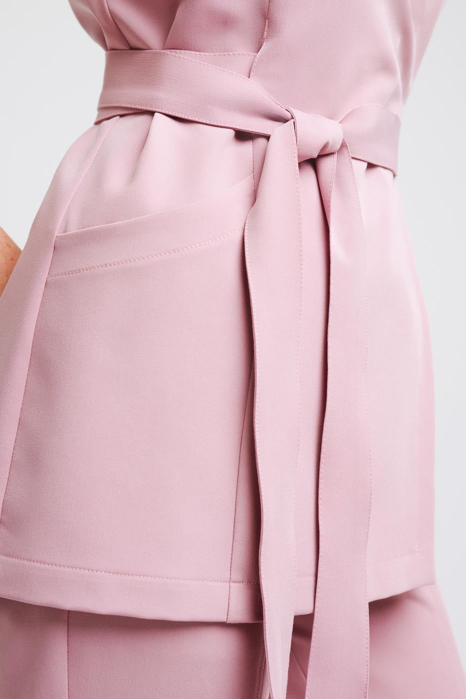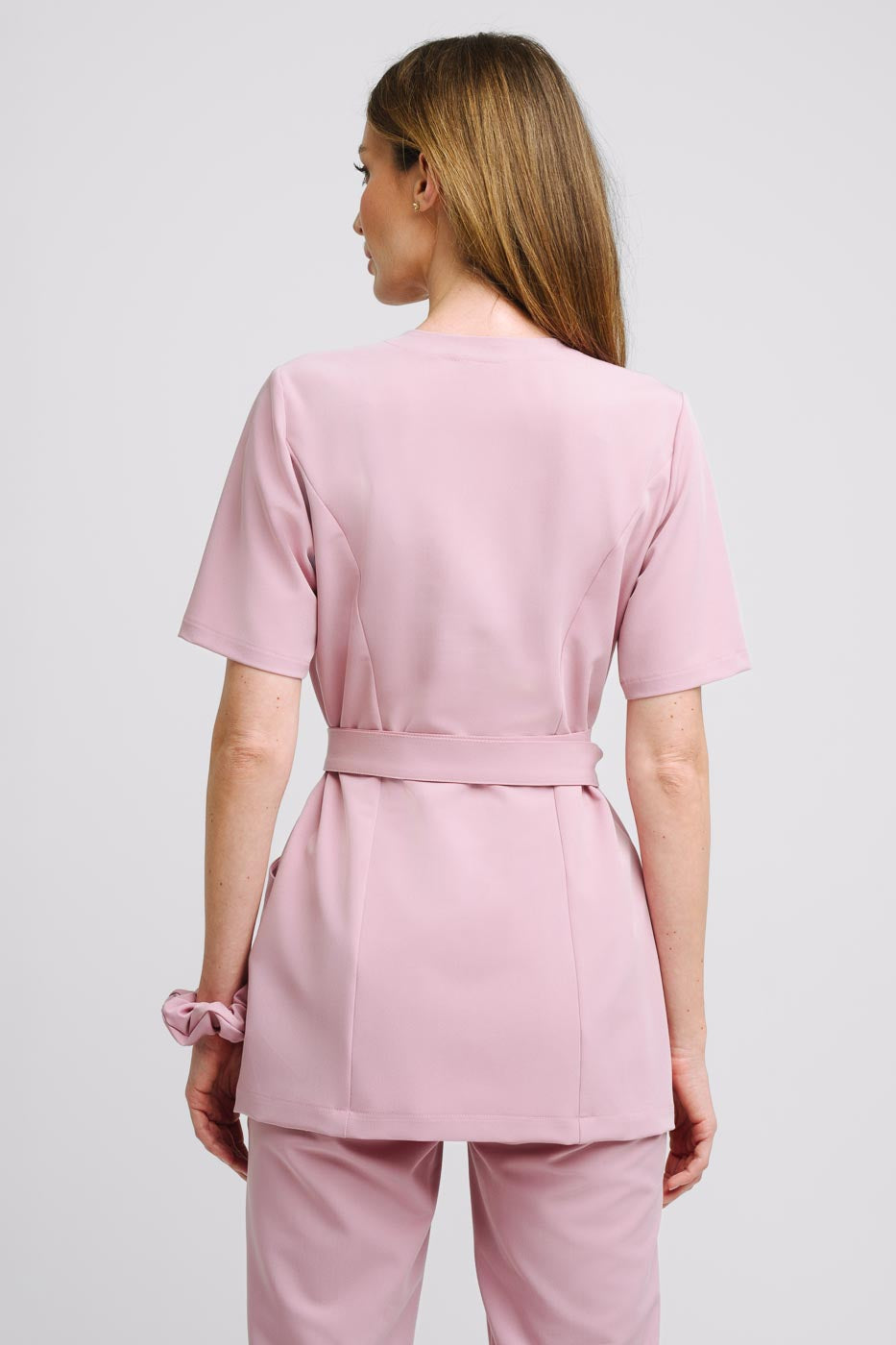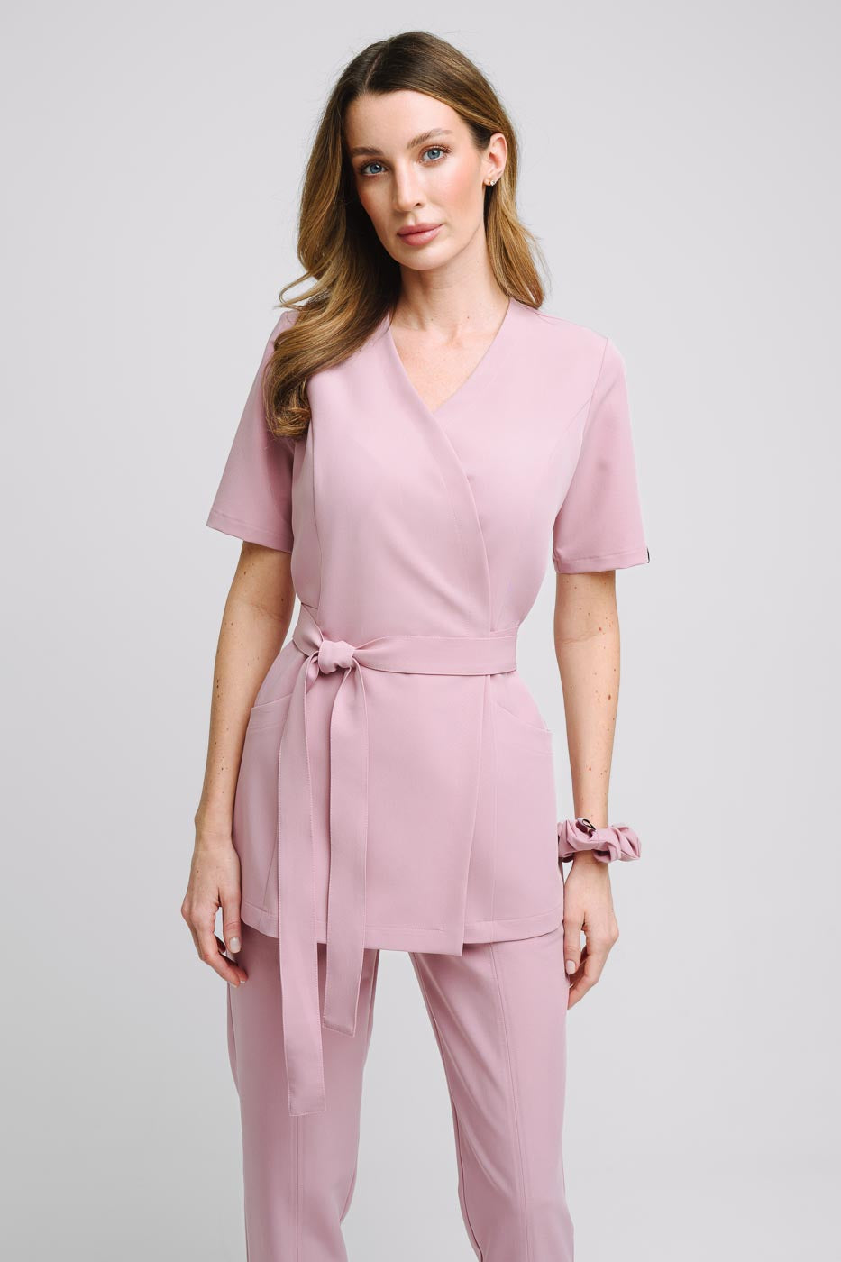 Bardzo kobieca kopertowa bluza medyczna Aria uszyta z wysokogatunkowej i miękkiej tkaniny Viscon z bogatą zawartością splotów wiskozy. Pracując w ochronie zdrowia lub branży beauty potrzebujesz uniformu, w którym będziesz się czuła wygodnie, elegancko ale i kobieco. Tunika wiązana Aria idealnie spełni te potrzeby. Przy projektowaniu tej bluzy kładliśmy nacisk na to abyś czuła się profesjonalnie w swojej pracy, zadbaliśmy o idealną długość bluzy oraz zabezpieczenie dekoltu napą. Każda z nas lubi się czuć atrakcyjnie, więc pasek w bluzie Aria możesz zawiązać na 3 różne sposoby: z przodu, z tyłu oraz z boku. W naszym projekcie zadbaliśmy o to aby wiązanie idealnie podkreślało Twoją talię. Cięcie francuskie w biuście zapewnia idealny kształt bluzy. Rękawki w tunice medycznej Aria są długości midi, co oznacza że są przed łokieć. Przy wielu godzinach spędzanych w tym fartuszku zdecydowanie docenisz tą długość! Nad modelem pracowaliśmy bardzo długo przerabiając różne detale, ale jesteśmy przekonani że to najwygodniejsza bluza kopertowa dostępna na polskim rynku!