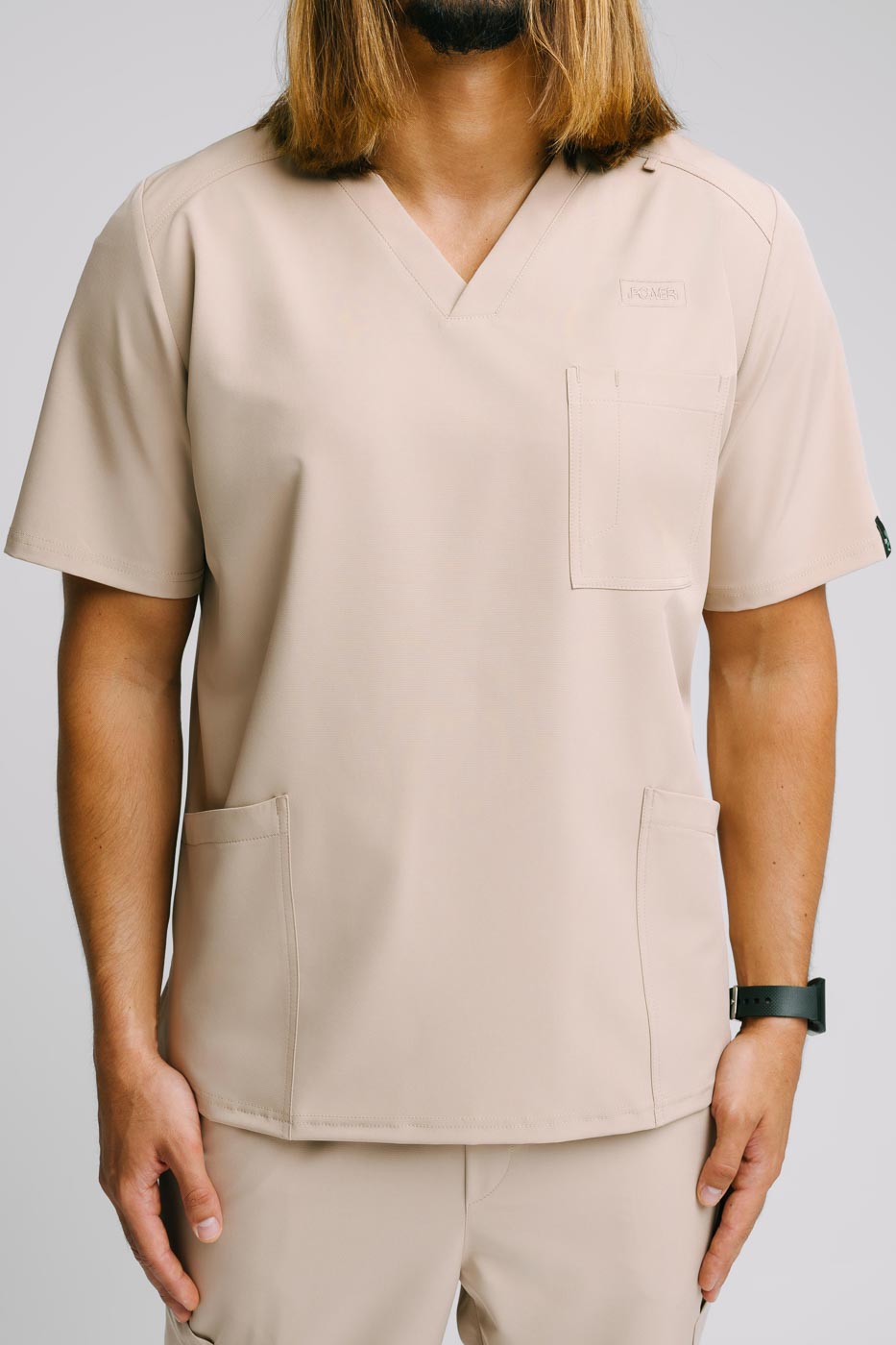 Bluza medyczna męska Nathan wykonana z lejącego, elastycznego w czterech kierunkach, chłodnego w dotyku materiału idealnego na ciepłe dni. Posiada trzy kieszenie, dekolt w serek, przeszycia na ramionach. Kieszenie są naszywane na wierzch bluzy. Każda z kieszeni zabezpieczona jest specjalistycznymi ryglami, które oprą się wielokrotnemu praniu i nie ustąpią przed mnóstwem Twoich bibelotów. Każda kieszeń obszyta jest podwójną nicią specjalistycznie nazywaną dwuigłówką podkreślającą dopracowanie bluzy w najdrobniejszych elementach. Górna kieszeń posiada dodatkowe, praktyczne przeszycie na długopis. Dekolt w literę V również wykończony jest subtelną nicią. Na ramionach występują skośne elementy zakończone dwuigłówką. Ta sama podwójna nić użyta jest przy zakończeniach rękawków oraz na dole bluzy. Dzięki tak poprowadzonemu szyciu bluza jest niezwykle dopracowana i trwała. Dodatkowym elementem uzupełniającym cały look jest mała pętelka wszyta nad górną kieszenią, możesz do niej przypiąć np. identyfikator. Pęknięcia na boku bluzy zapewnią komfort podczas siadania czy chodzenia. Tył bluzy złożony jest z dwóch elementów łączących się na łopatkach. Takie łączenie optycznie poszerza barki i łączy się z niezwykle stylowym przodem.