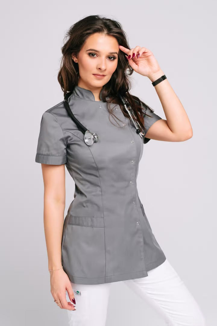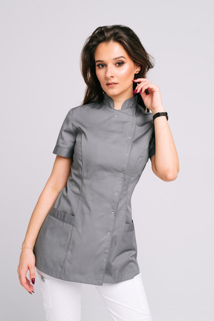 Fartuch Iga wykonany z trwałego materiału zapinany na napy. Dopasowany, taliowany krój podkreślający figurę. Fartuch z krótkimi rękawami i stójką. Dwie duże kieszenie usytuowane z przodu bluzki. Klasyka w nowoczesnym wydaniu.
